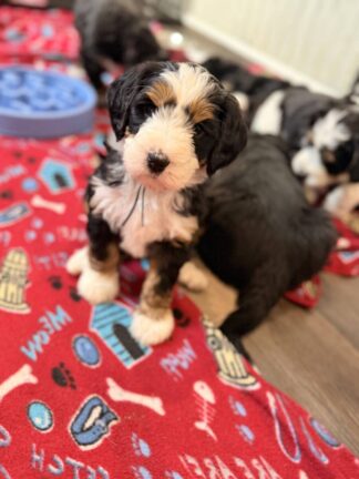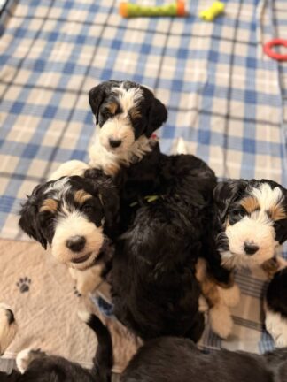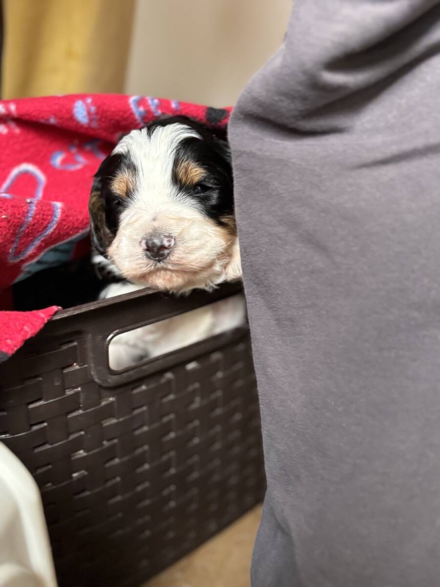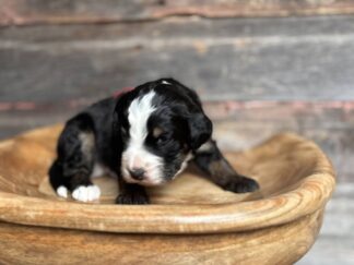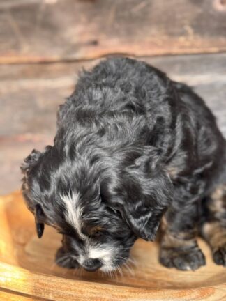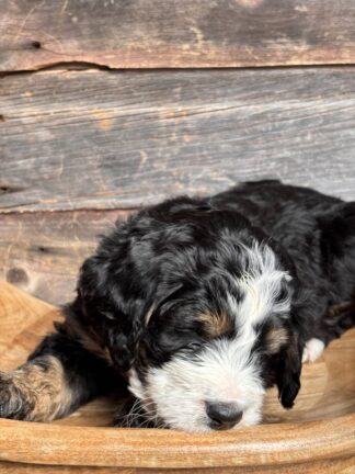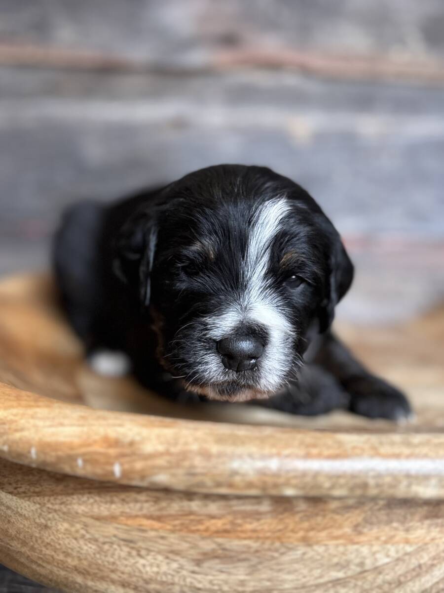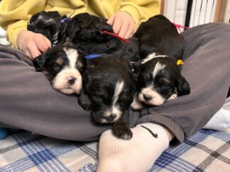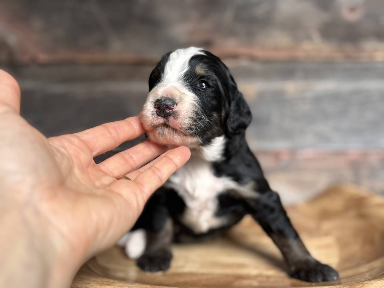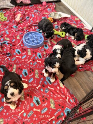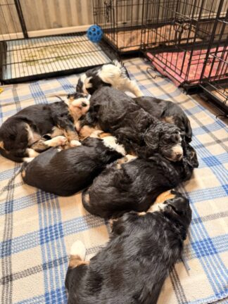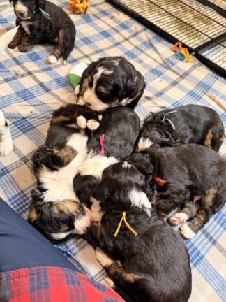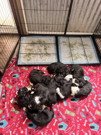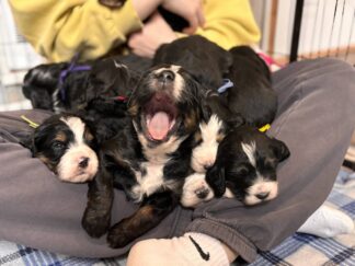 I had too many pictures to go into the weekend without an update. Puppies just started peeking their eyes open which is the start to the starting to explore more the world around them. Photos of their first week or two with eyes open can look a bit off but their eyes will continue to develop and become a deep rich brown by the time they go home. All the pink noses will turn black overtime also. Lots of changes and growth happening before our eyes. Each one is so precious!