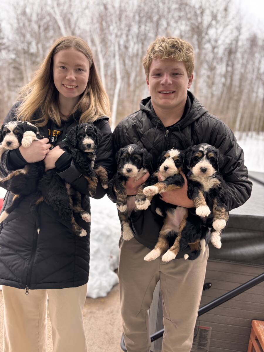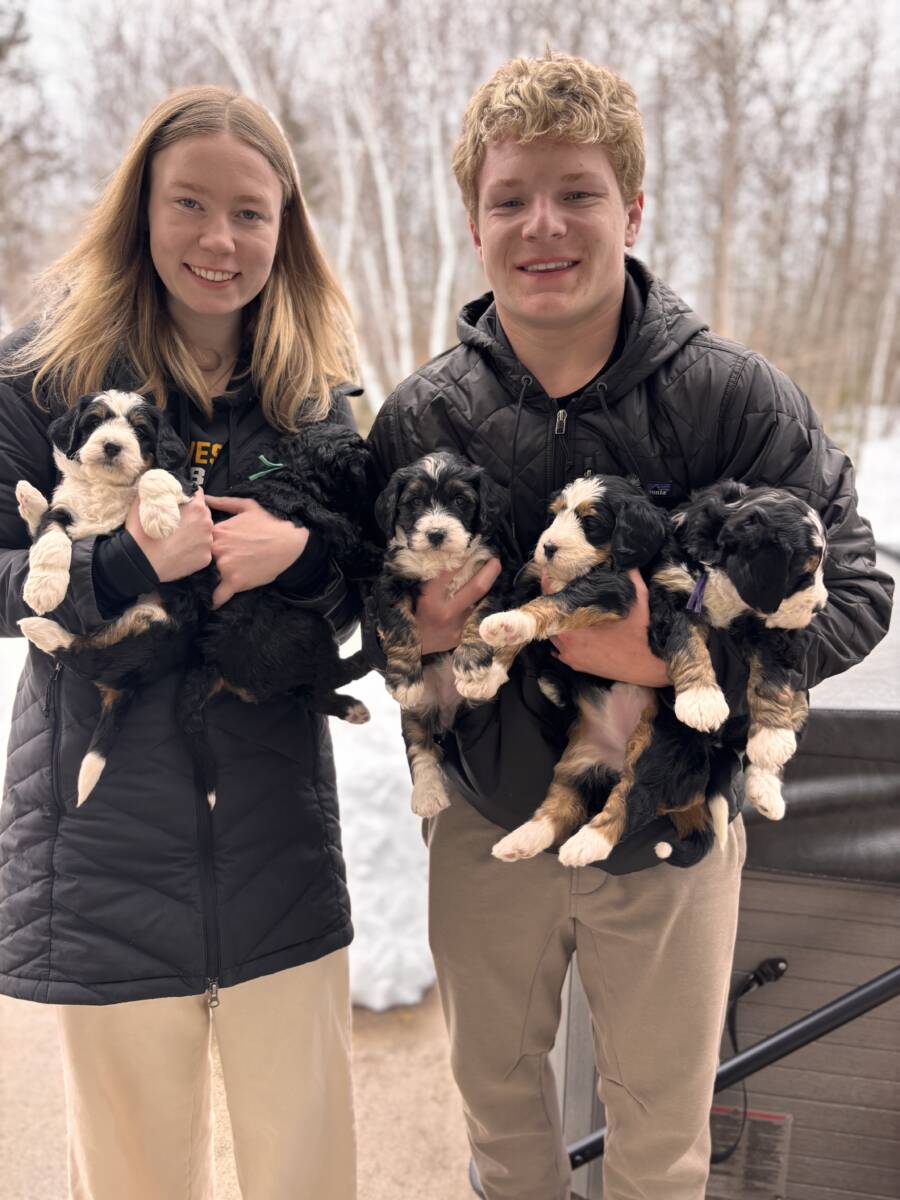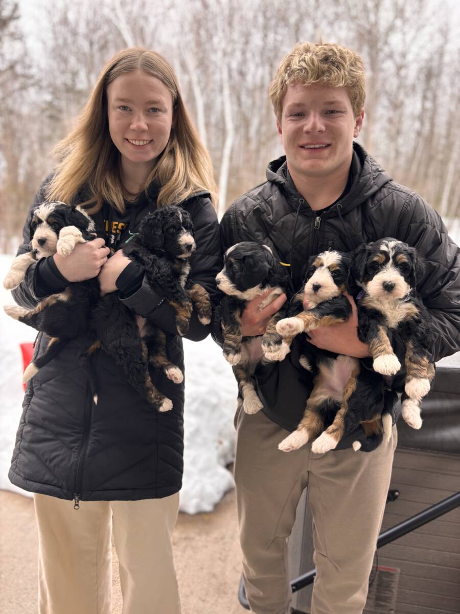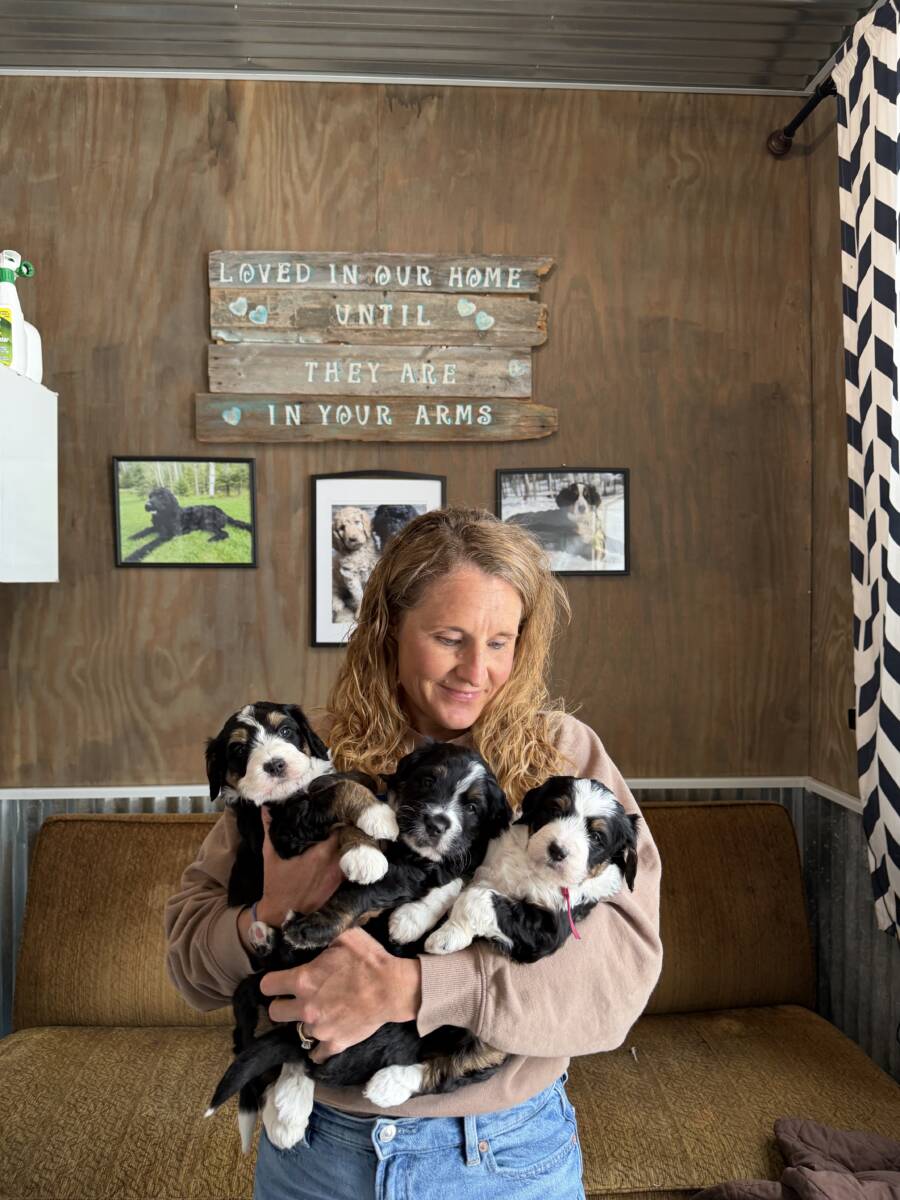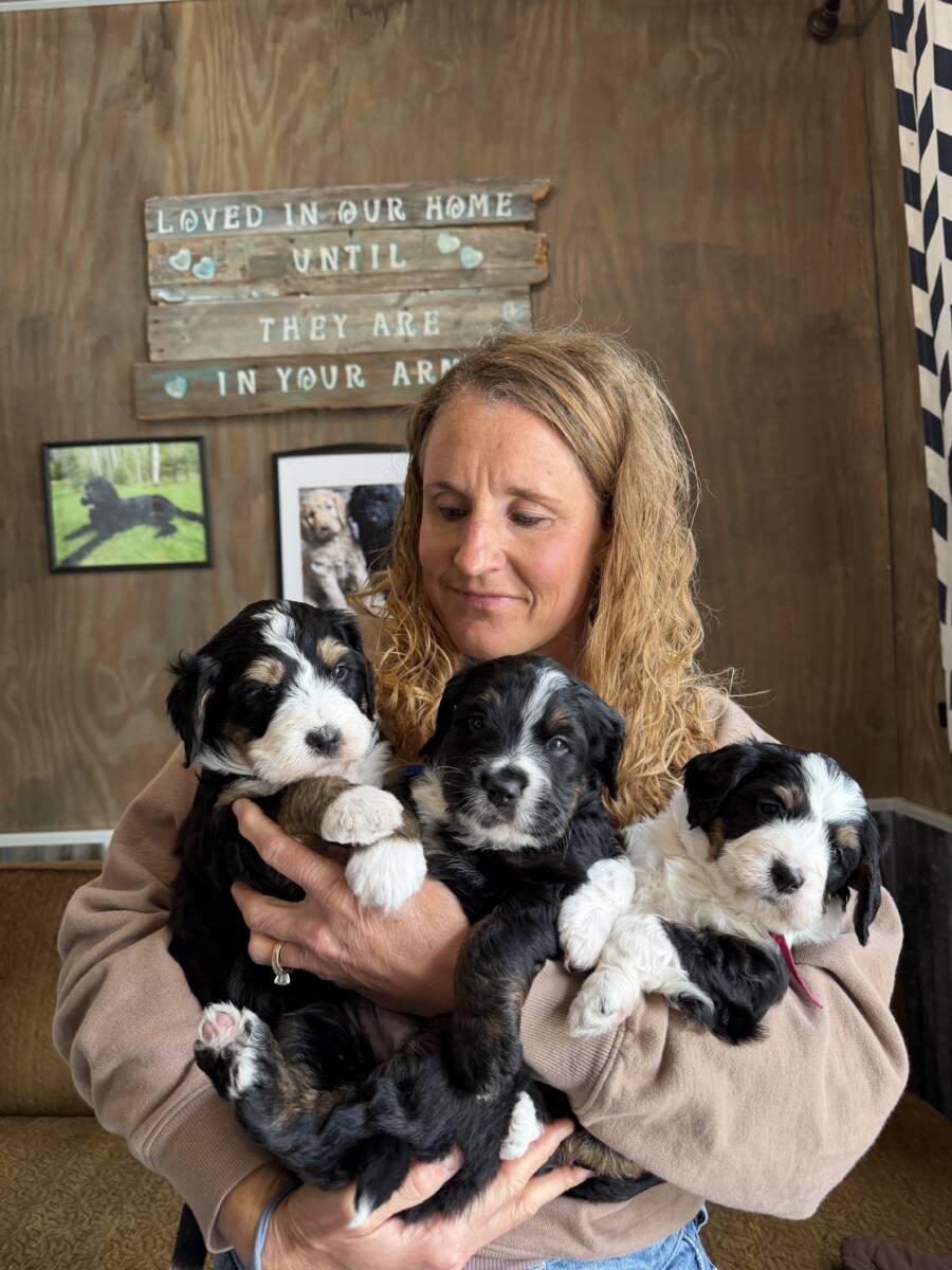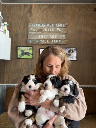 It has been so working with families this week to pick the best puppy for their home and now to have name for them for us to call them by! This week we will continue to have puppies spend naps in crates. Uecker has finished nursing to give puppies ample time to adjust to only eating dog food that we still soften. Puppies have their vet appointment Monday where they will have a full exam, vaccines, and be microchipped. Most potties are being done outside (unless we are distracted with visitors) and we are so excited for the sunshine and warmer temps that are coming to give puppies more time to play outside. We continue to give them time with our other dogs to help them become comfortable with other animals. We will begin to encourage puppies to sit when they greet us which is something that is so important to continue to reinforce once they come home. We are absolutely loving each puppy so much and can’t believe we are getting so close to take home!