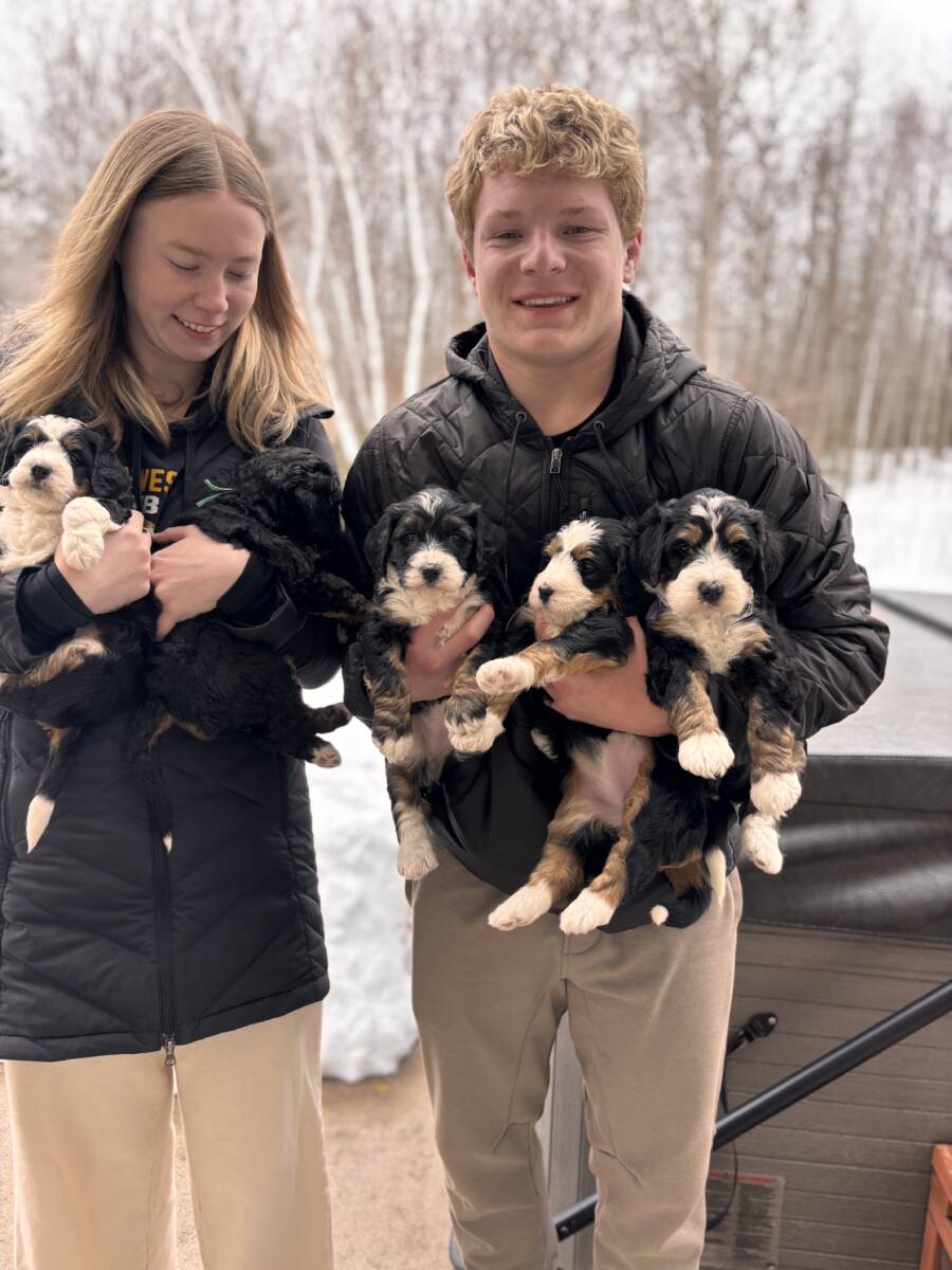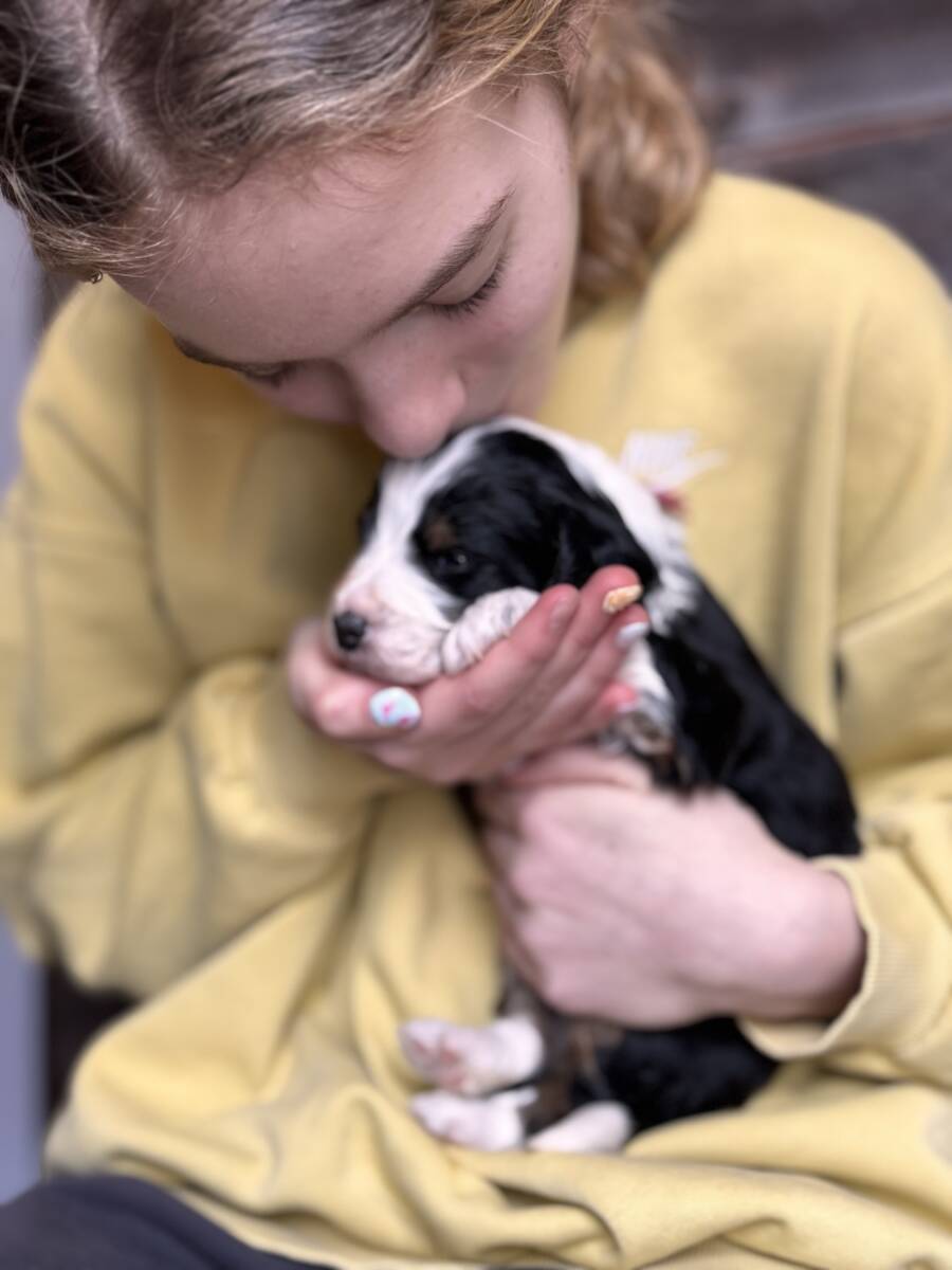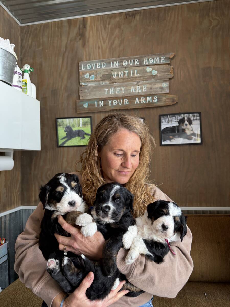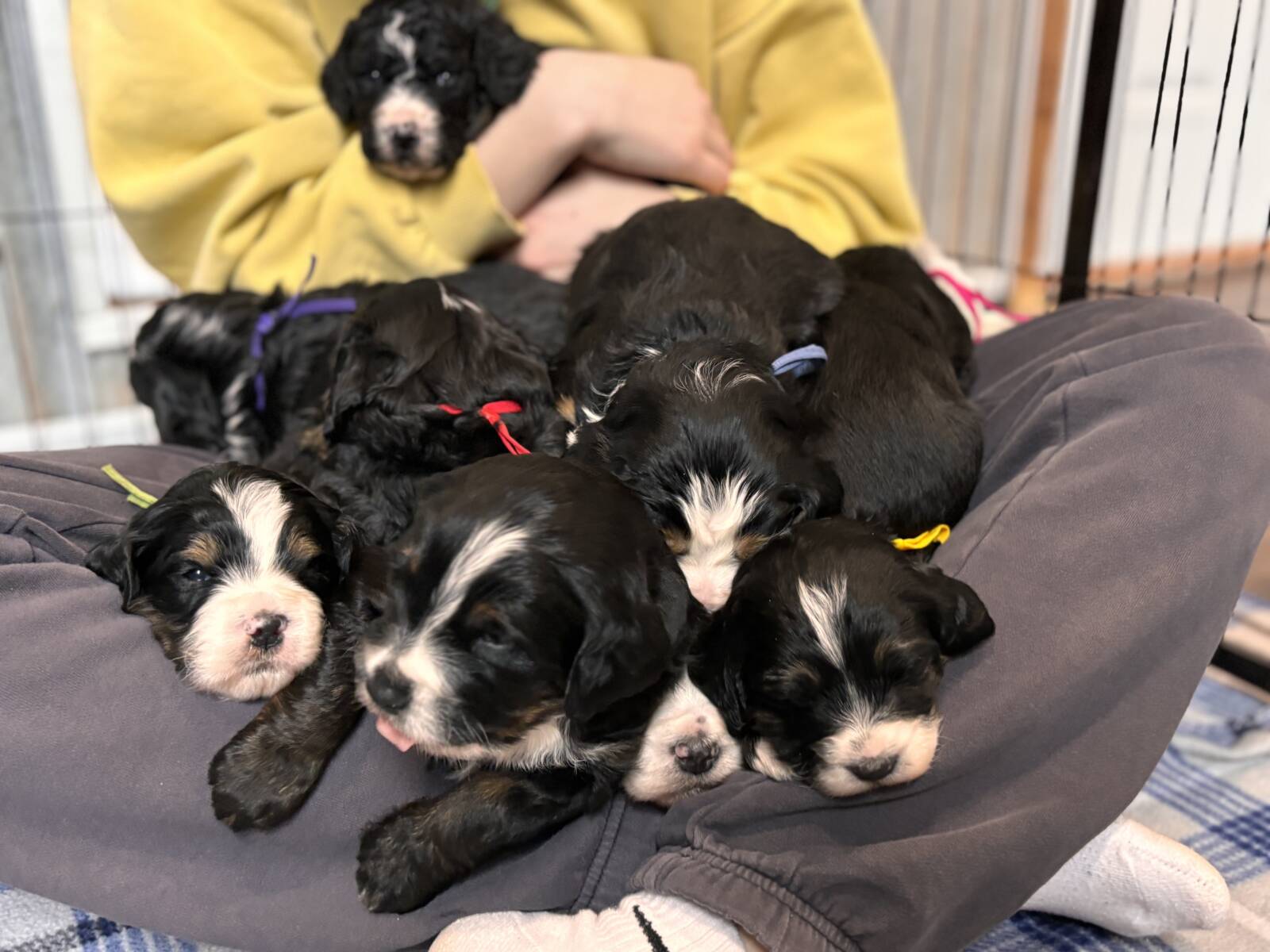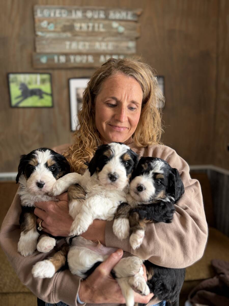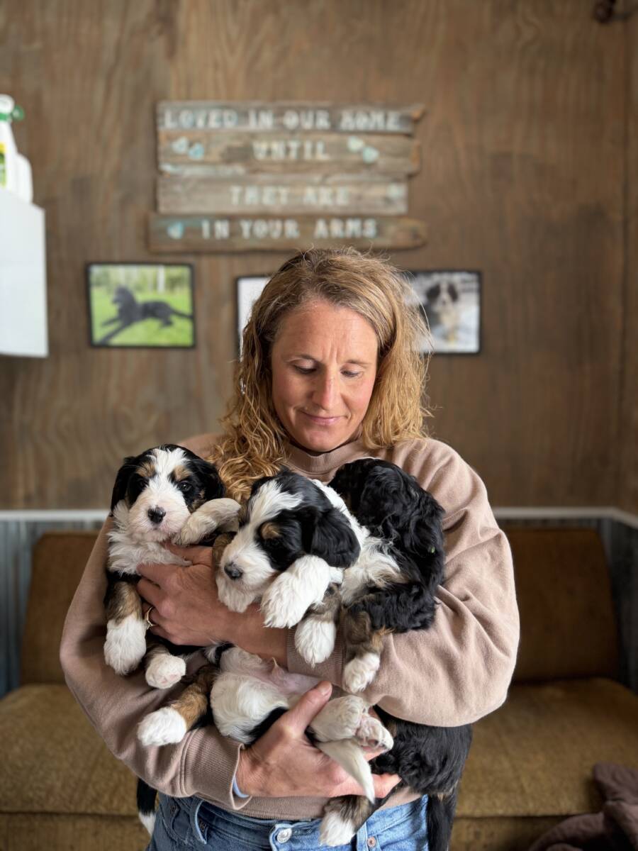 It has been so working with families this week to pick the best puppy for their home and now to have name for them for us to call them by! This week we will continue to have puppies spend naps in crates. Uecker has finished nursing to give puppies ample time to adjust to only eating dog food that we still soften. Puppies have their vet appointment Monday where they will have a full exam, vaccines, and be microchipped. Most potties are being done outside (unless we are distracted with visitors) and we are so excited for the sunshine and warmer temps that are coming to give puppies more time to play outside. We continue to give them time with our other dogs to help them become comfortable with other animals. We will begin to encourage puppies to sit when they greet us which is something that is so important to continue to reinforce once they come home. We are absolutely loving each puppy so much and can’t believe we are getting so close to take home!