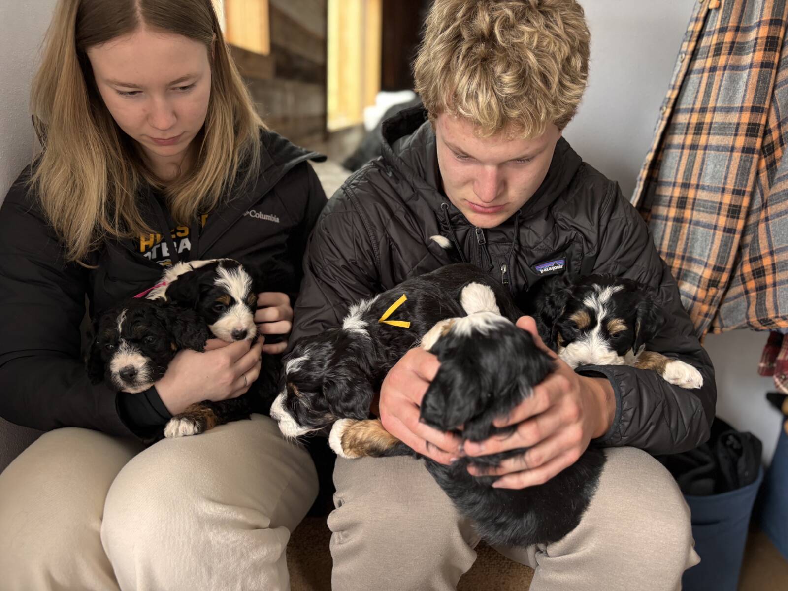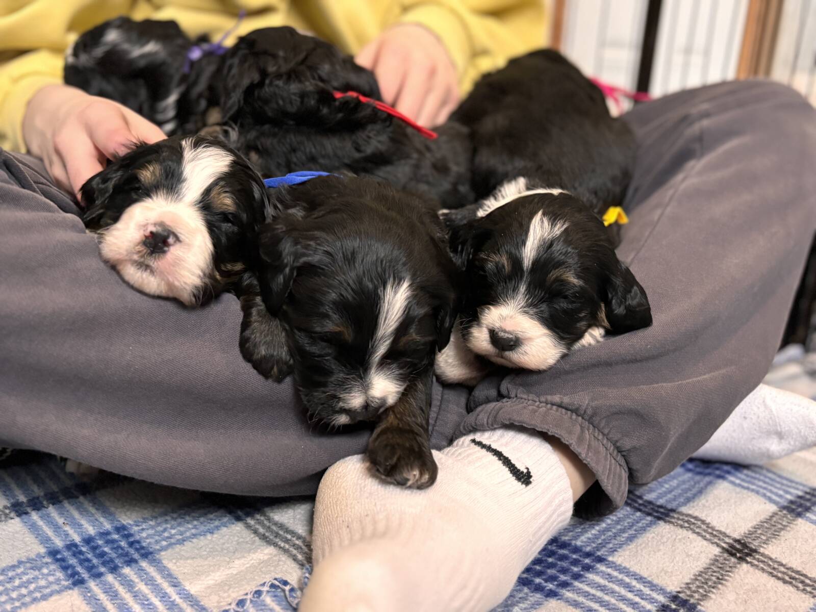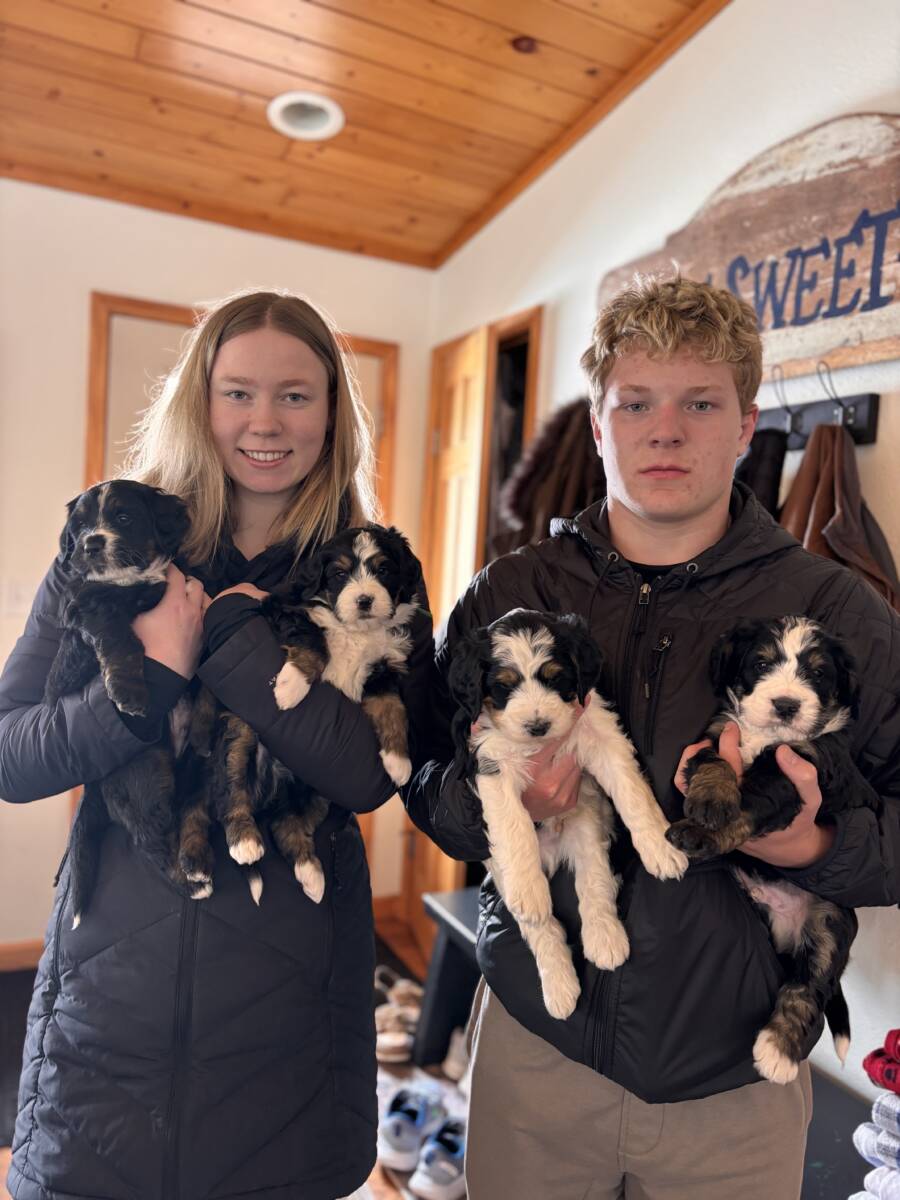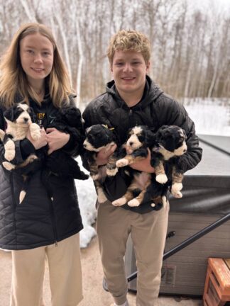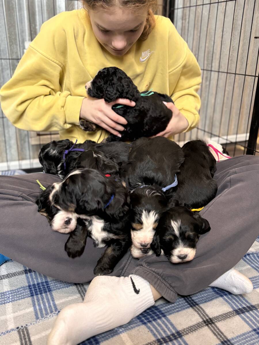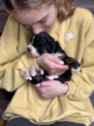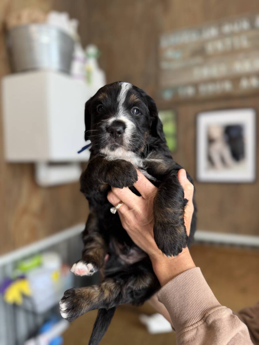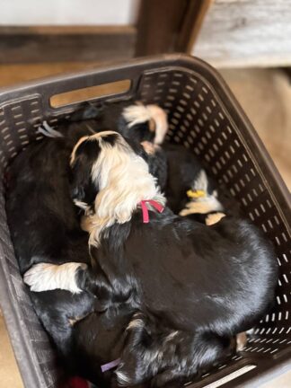 It has been so working with families this week to pick the best puppy for their home and now to have name for them for us to call them by! This week we will continue to have puppies spend naps in crates. Uecker has finished nursing to give puppies ample time to adjust to only eating dog food that we still soften. Puppies have their vet appointment Monday where they will have a full exam, vaccines, and be microchipped. Most potties are being done outside (unless we are distracted with visitors) and we are so excited for the sunshine and warmer temps that are coming to give puppies more time to play outside. We continue to give them time with our other dogs to help them become comfortable with other animals. We will begin to encourage puppies to sit when they greet us which is something that is so important to continue to reinforce once they come home. We are absolutely loving each puppy so much and can’t believe we are getting so close to take home!