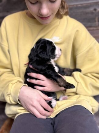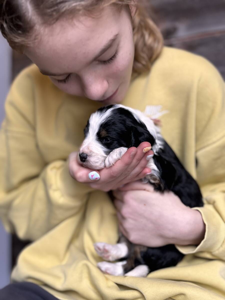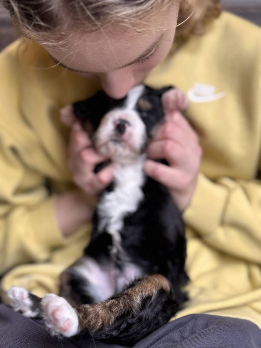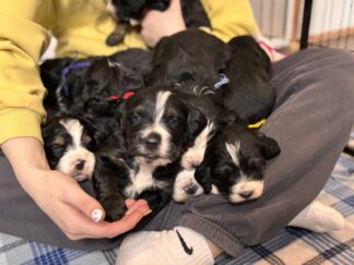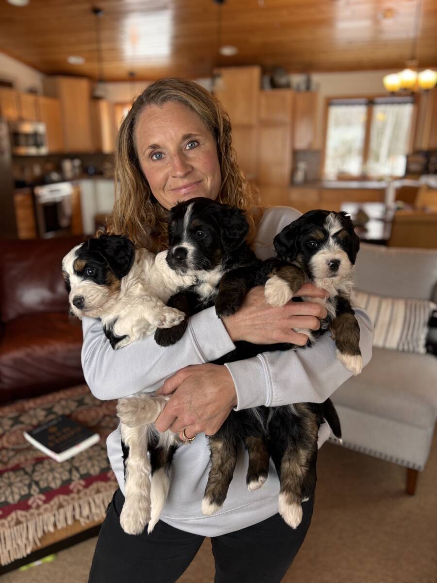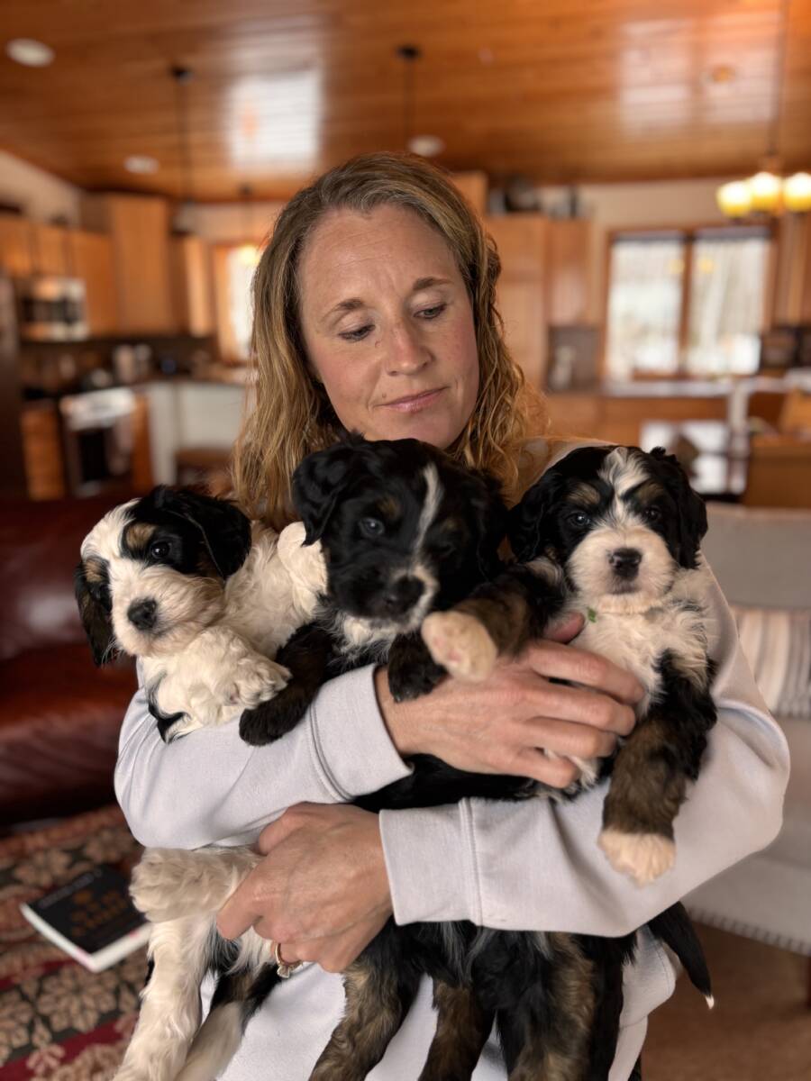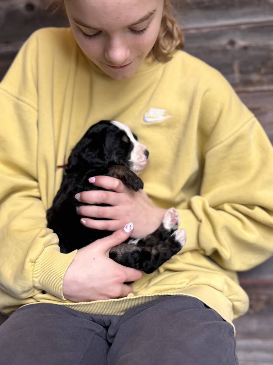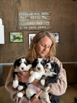It has been so working with families this week to pick the best puppy for their home and now to have name for them for us to call them by! This week we will continue to have puppies spend naps in crates. Uecker has finished nursing to give puppies ample time to adjust to only eating dog food that we still soften. Puppies have their vet appointment Monday where they will have a full exam, vaccines, and be microchipped. Most potties are being done outside (unless we are distracted with visitors) and we are so excited for the sunshine and warmer temps that are coming to give puppies more time to play outside. We continue to give them time with our other dogs to help them become comfortable with other animals. We will begin to encourage puppies to sit when they greet us which is something that is so important to continue to reinforce once they come home. We are absolutely loving each puppy so much and can’t believe we are getting so close to take home!