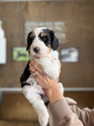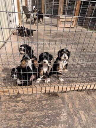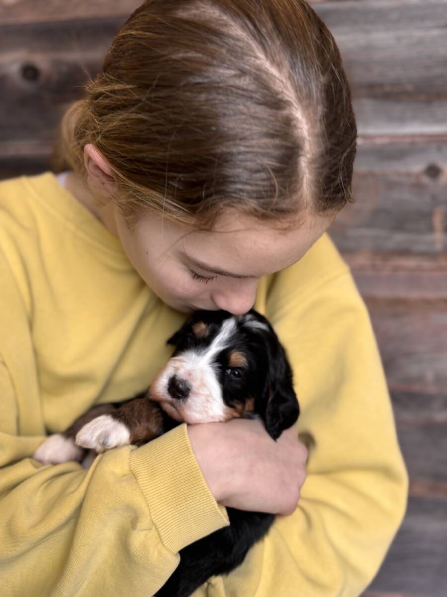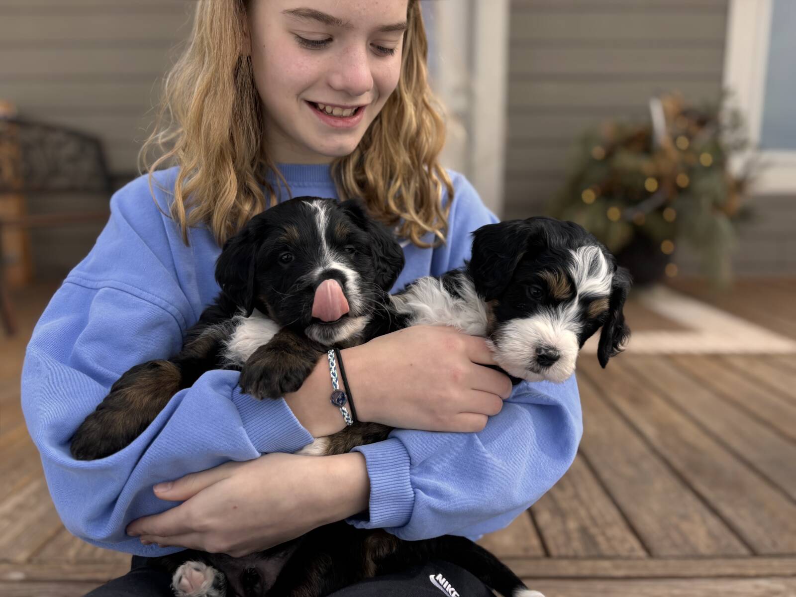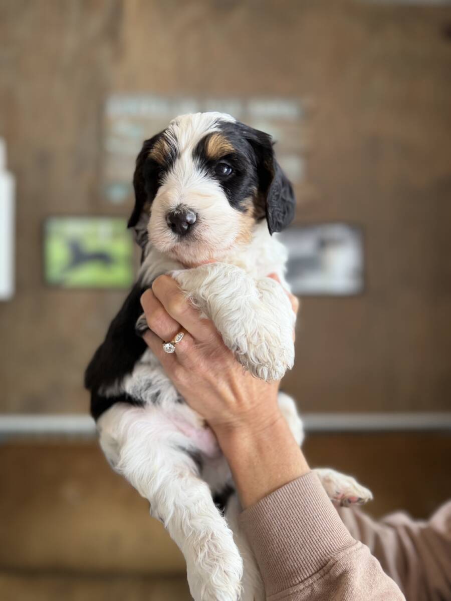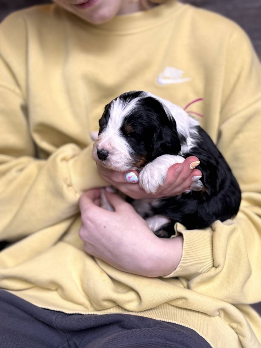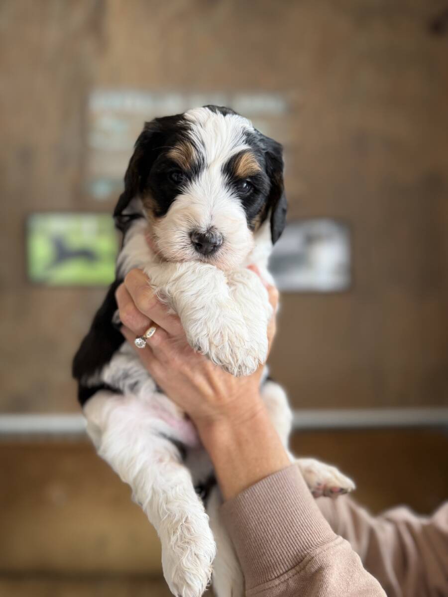 It has been so working with families this week to pick the best puppy for their home and now to have name for them for us to call them by! This week we will continue to have puppies spend naps in crates. Uecker has finished nursing to give puppies ample time to adjust to only eating dog food that we still soften. Puppies have their vet appointment Monday where they will have a full exam, vaccines, and be microchipped. Most potties are being done outside (unless we are distracted with visitors) and we are so excited for the sunshine and warmer temps that are coming to give puppies more time to play outside. We continue to give them time with our other dogs to help them become comfortable with other animals. We will begin to encourage puppies to sit when they greet us which is something that is so important to continue to reinforce once they come home. We are absolutely loving each puppy so much and can’t believe we are getting so close to take home!