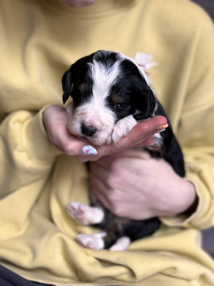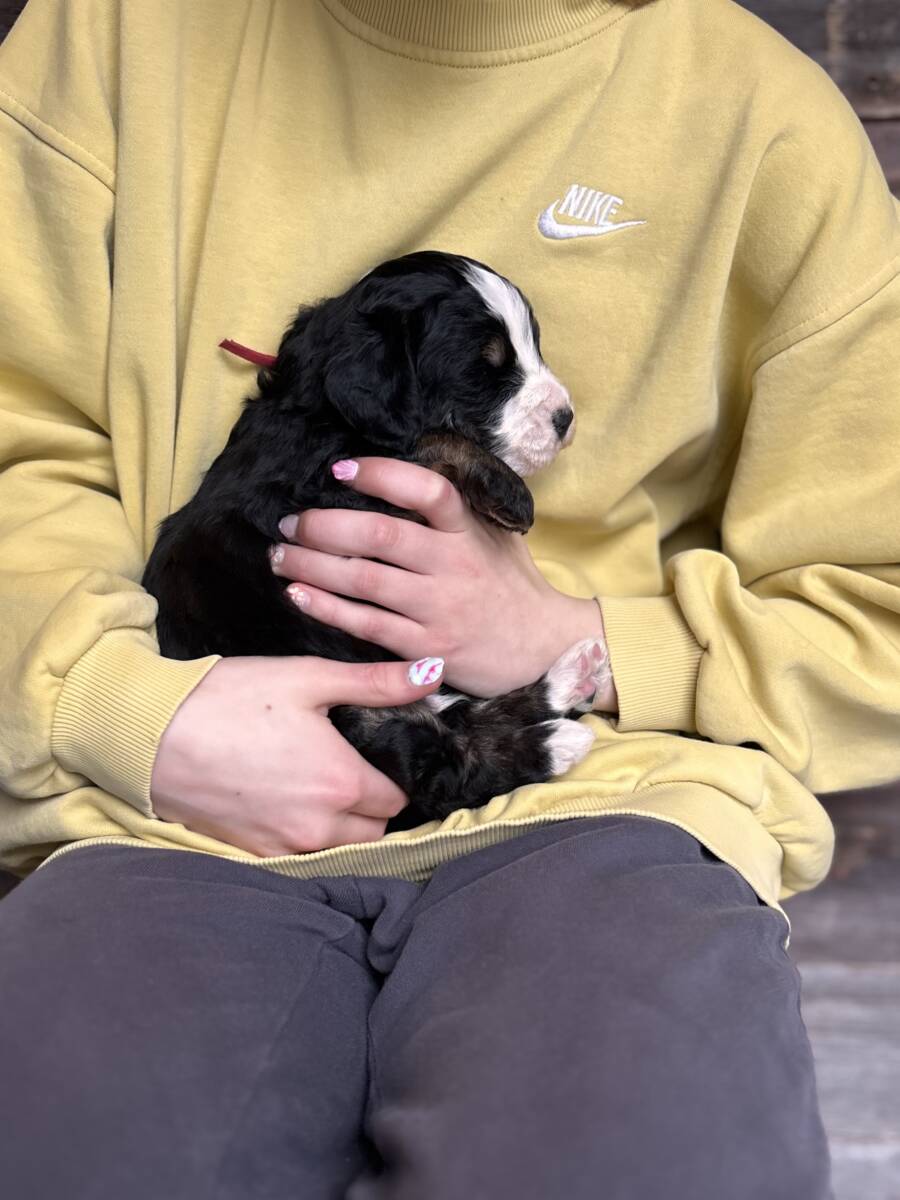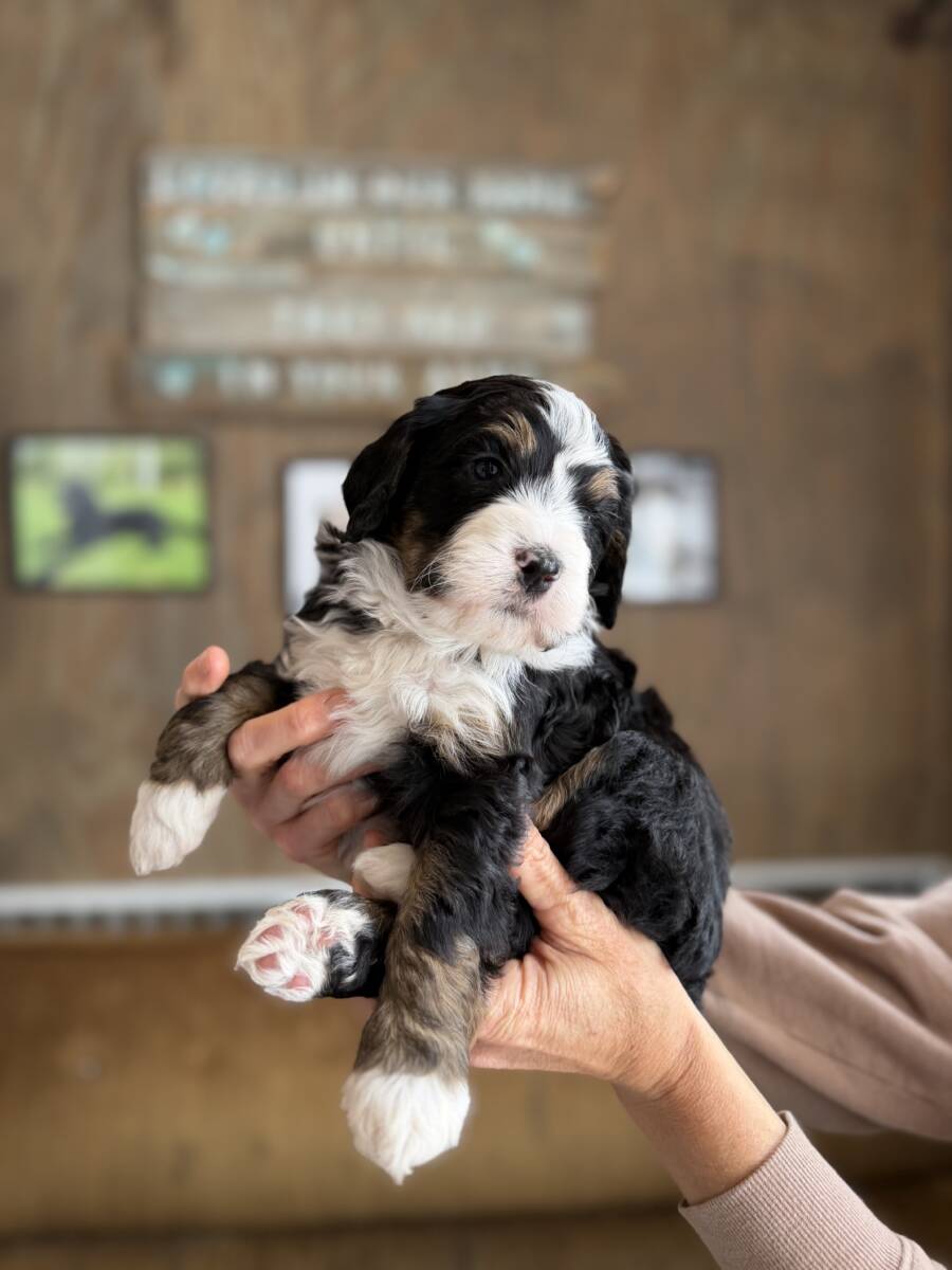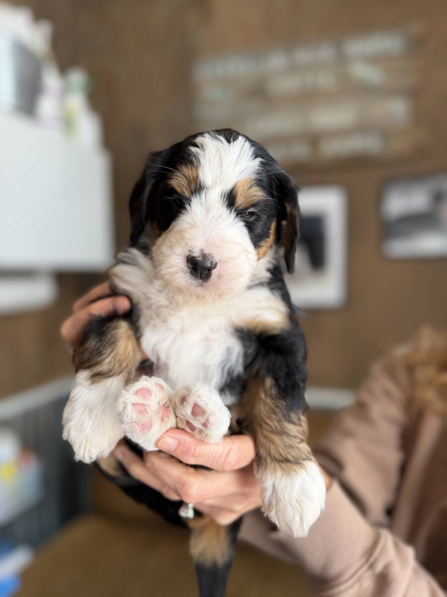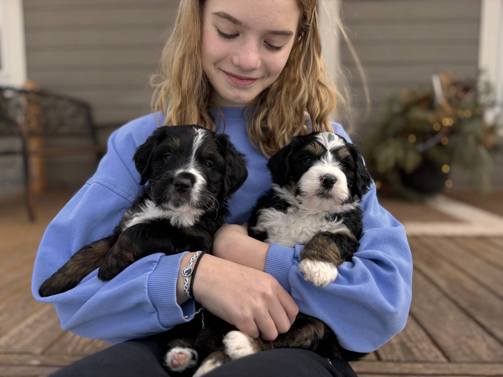 It has been so working with families this week to pick the best puppy for their home and now to have name for them for us to call them by! This week we will continue to have puppies spend naps in crates. Uecker has finished nursing to give puppies ample time to adjust to only eating dog food that we still soften. Puppies have their vet appointment Monday where they will have a full exam, vaccines, and be microchipped. Most potties are being done outside (unless we are distracted with visitors) and we are so excited for the sunshine and warmer temps that are coming to give puppies more time to play outside. We continue to give them time with our other dogs to help them become comfortable with other animals. We will begin to encourage puppies to sit when they greet us which is something that is so important to continue to reinforce once they come home. We are absolutely loving each puppy so much and can’t believe we are getting so close to take home!