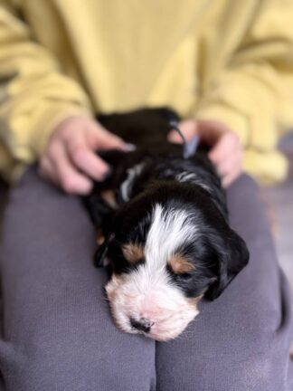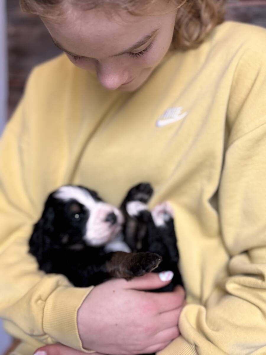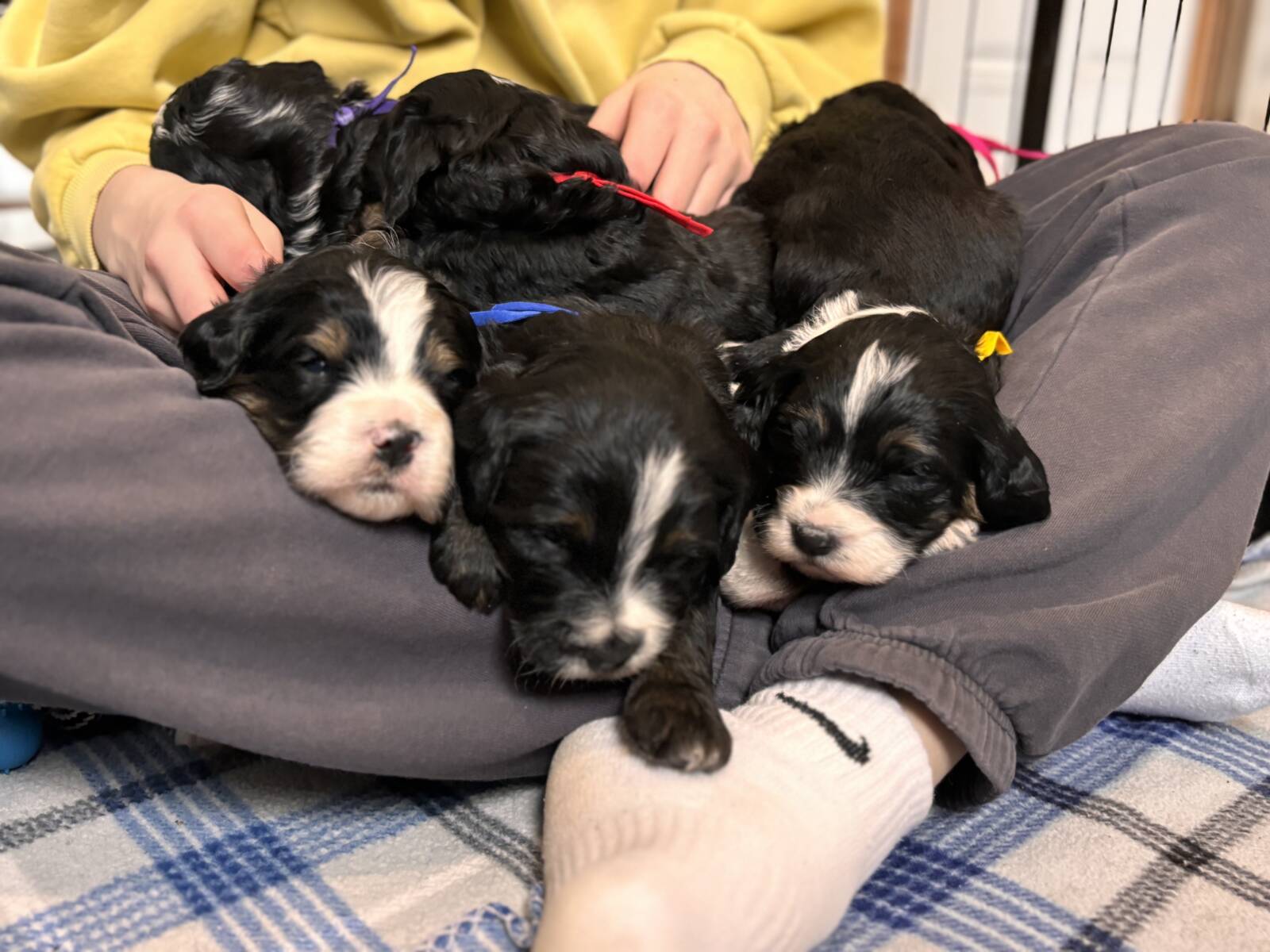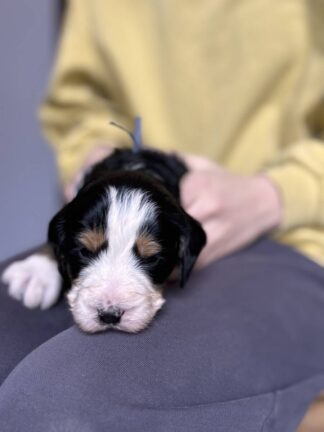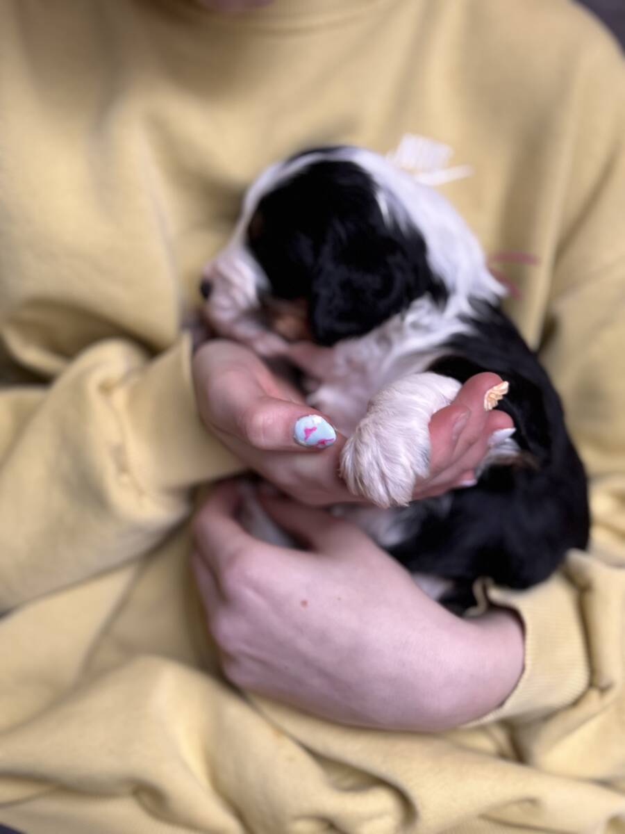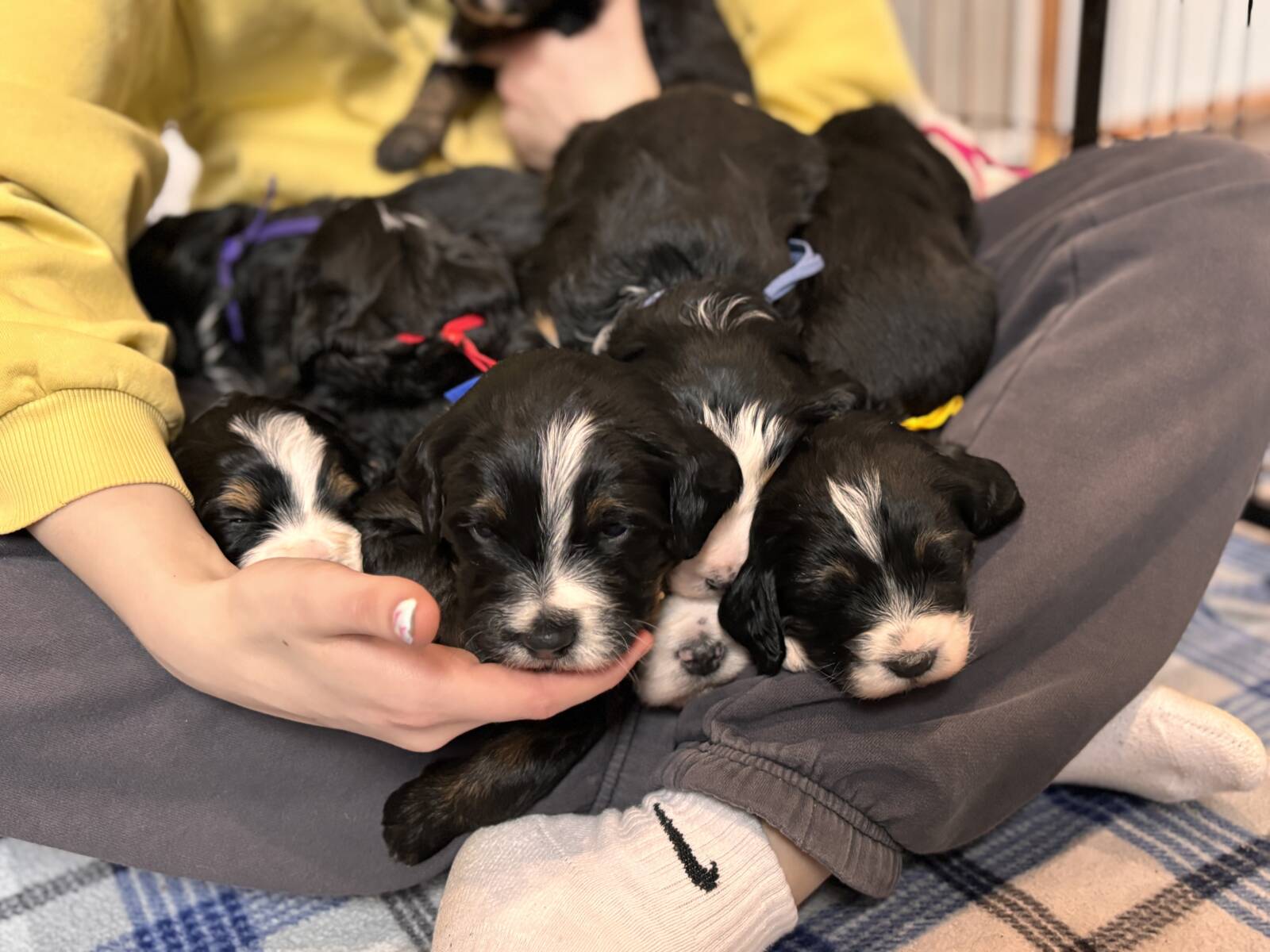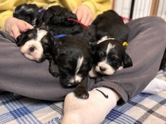 Puppies have started to open their eyes and are moving around more these days. They have started to take their first wobbly steps which is so fun to watch. Snuggles are our favorite part of the process and we are eating up each moment of this stage before they are more on the go. We continue to do our intentional “ENS” now twice daily with each puppy. Puppies have had their nails trimmed again and new collars to accommodate their growth. We will also give them their first dose of dewormer this week and will continue that every 2 weeks until they go home. By the end of this week puppies ears will be opening and then they will really begin to progress and learn more through their senses. Looking forward to a fun week ahead!