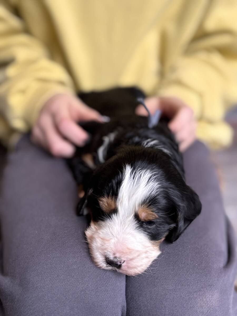 What an exciting week now that puppies can now see and hear their world is getting so much more exciting for them. They have found their voices and it is so fun to hear them use them and almost startle each other and themselves when they make their little barks and growls. It has been so fun to see them make the transition from the pool to a larger space. We have introduced a potty area and puppies are already moving away to find it when they need to go. We continue to do our intentional “ENS” time daily with puppies but have introduced a few new helpers during this process this week to give them more exposure to gentle helpers. Puppies will also spend time outside their are in new spaces to learn more and become comfortable being away from their siblings for short periods of time. As they can hear we will also intentionally start to make a loud noise followed by lots of snuggles and reassurance to help them become comfortable with new noises. Lots of growth this week so collars were once again loosened to accommodate their chunky necks and nails have been trimmed again to keep Mama safe from little scratches. So many fun things moving into this week that make the process so much fun!