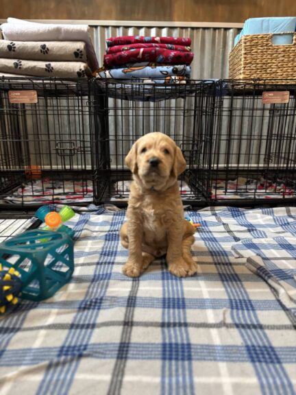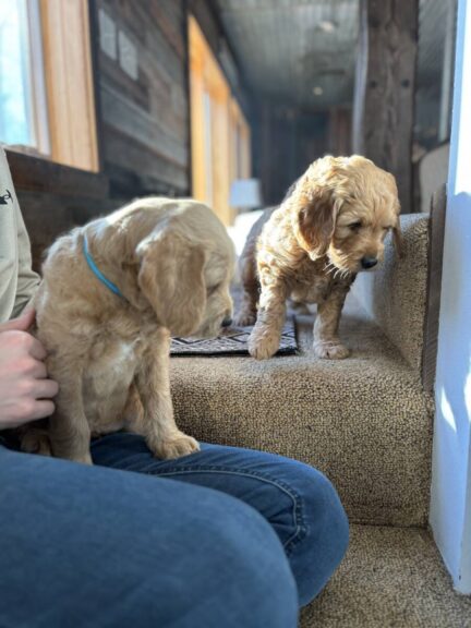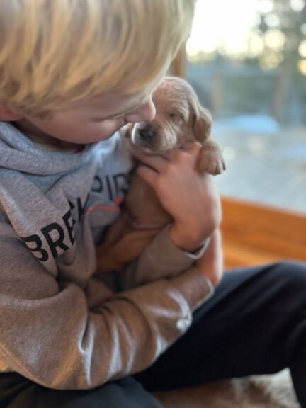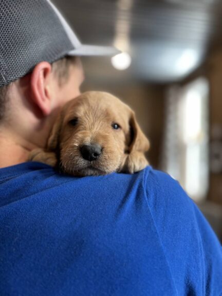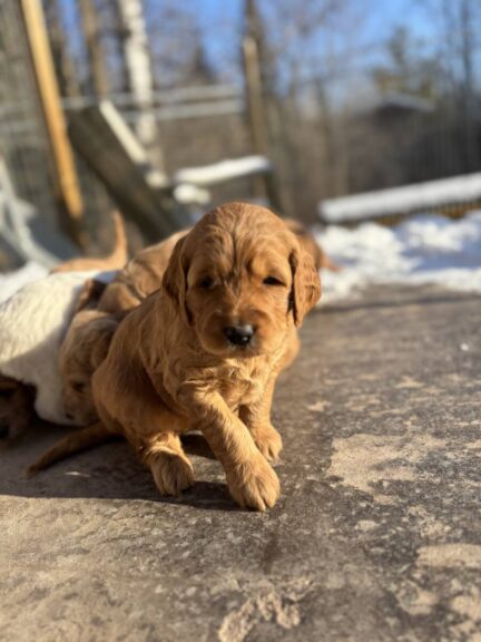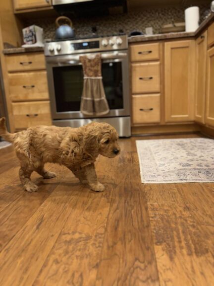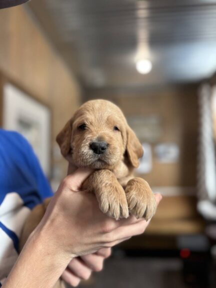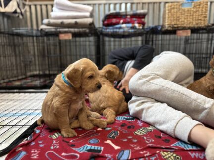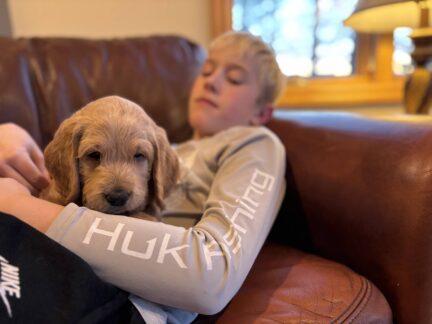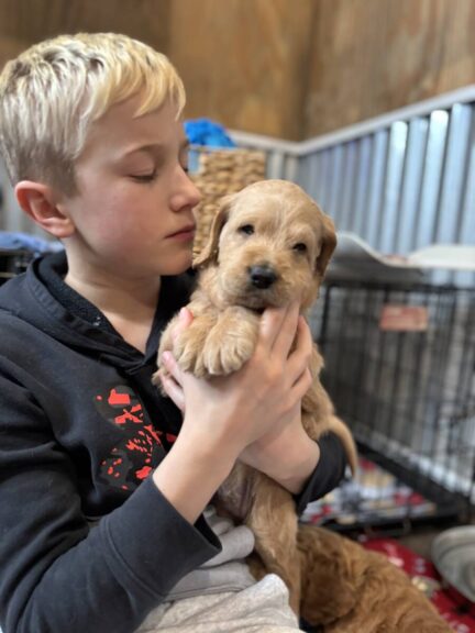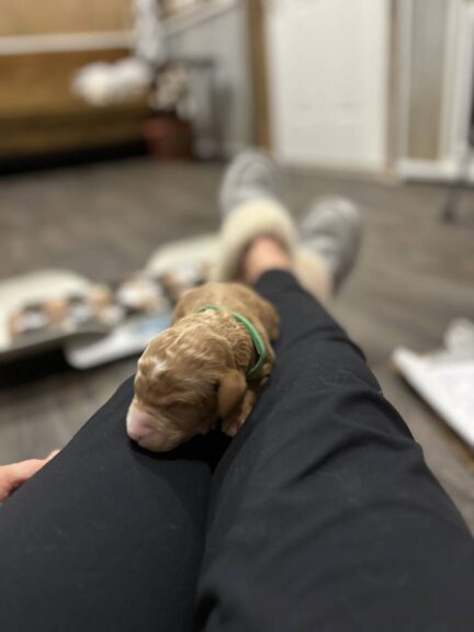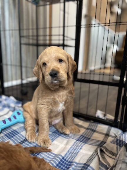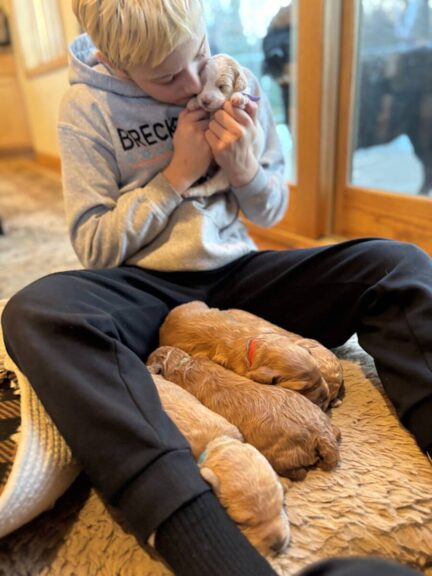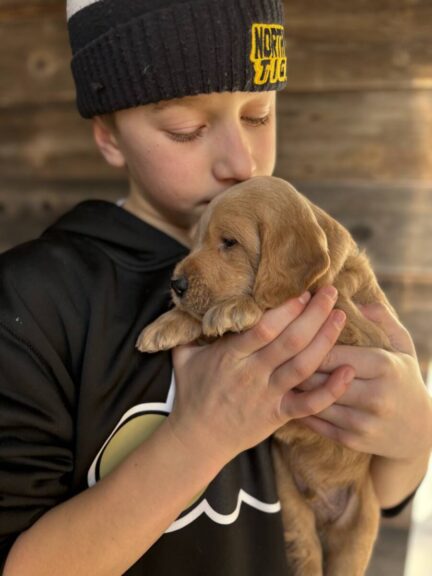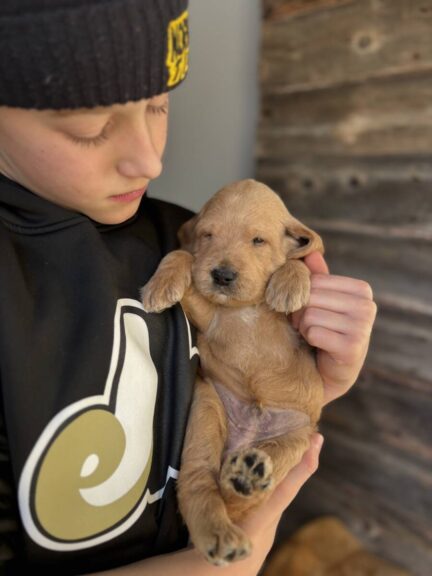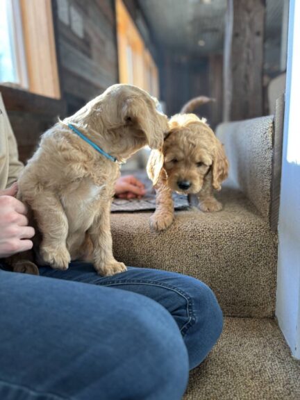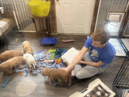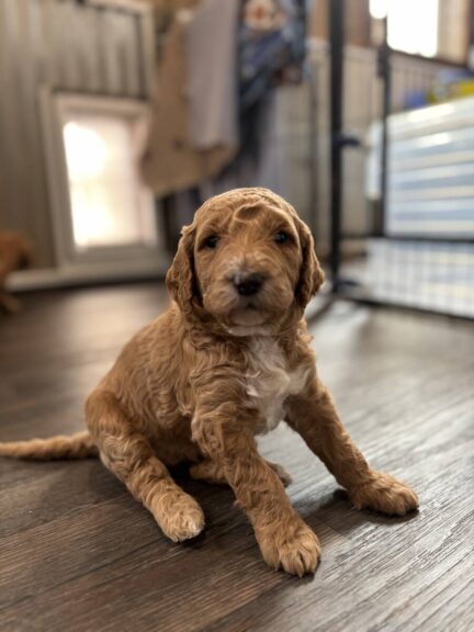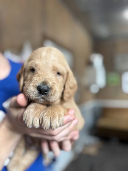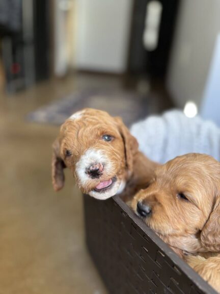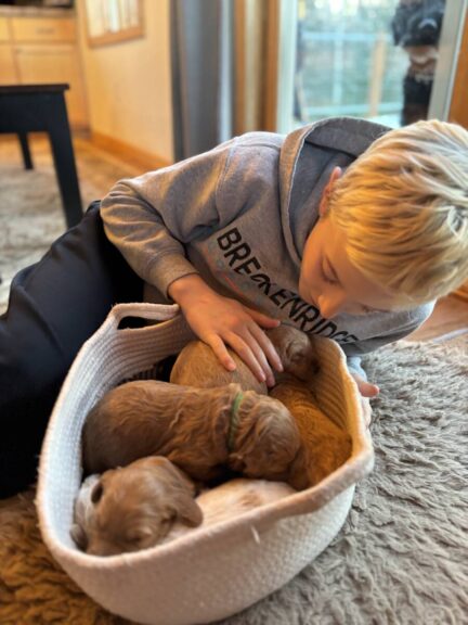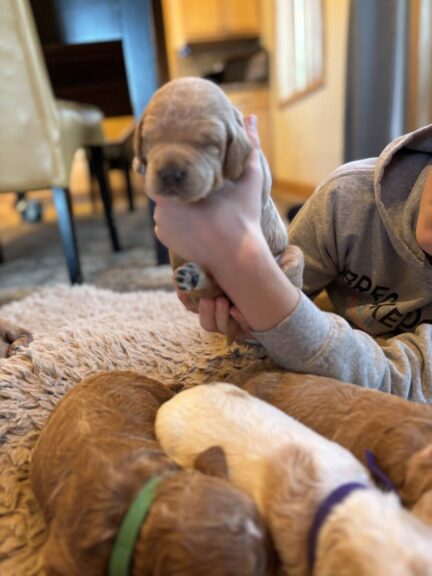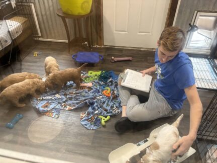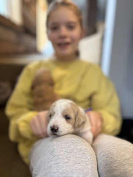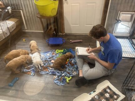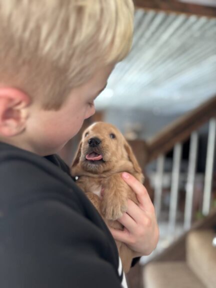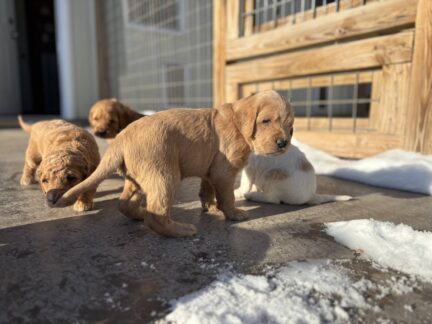 Puppies are at the funnest stage in our families opinion! They get so excited to see us and always are wagging their tails in excitement. We are looking forward this week as families start to pick their puppies. We will keep this page updated as puppies are chosen. This week we begin to have Kapri spend more time away from her puppies to start the weaning process. Puppies will have access to fresh water and by the end of the week will be eating 2-3 meals of very soft dog food. They will still nurse from Kapri but that will begin to be less as their teeth continue to grow in fully. We will continue to introduce them to new objects and toys daily. We will also work on startle response by making loud noises and then offer lots of reassurance. We also play a sounds CD several times daily to get them used to many sounds they may encounter during their lives like: fireworks, sirens, door bells, babies crying, and many more to help them become very accustomed to new sounds. We will have visits from more friends and family to give them lots of attention and get them used to more people. Puppies also will start to spend time outside as weather permits. This will get longer each day and potty breaks will be offered outside until they can start to use the doggie door and choose to go outside to potty on their own. Puppies will be separated from their siblings for short periods daily to interact with us 1 on 1. We will enlarge their area to give them more room to play and explore while continuing to provide an area for them to go potty. They will spend short periods of time in a crate just to become familiar with this new space. So many fun things to come this week!