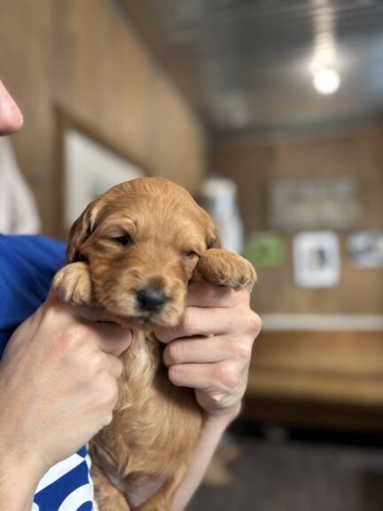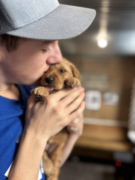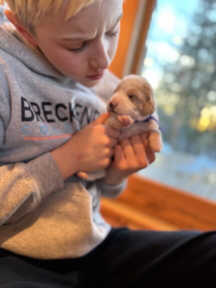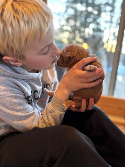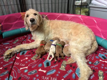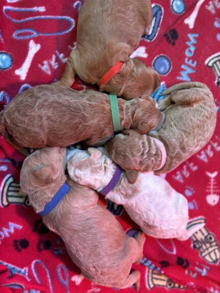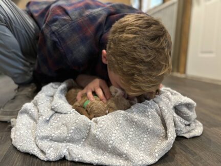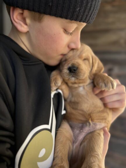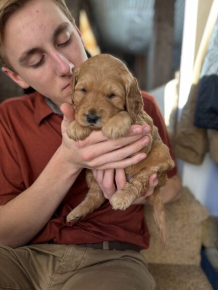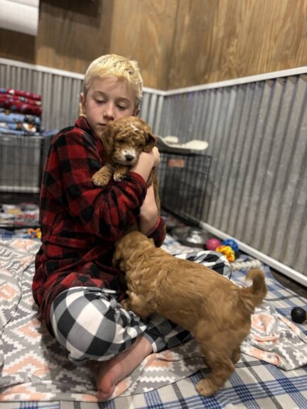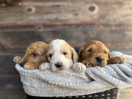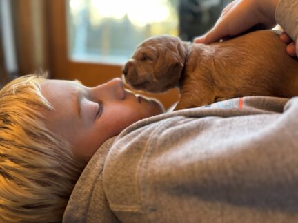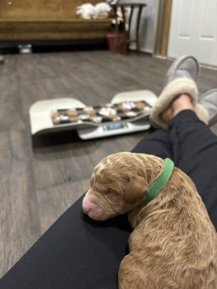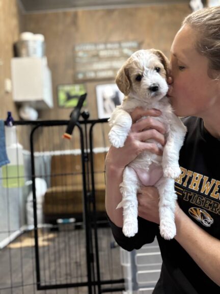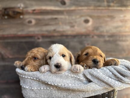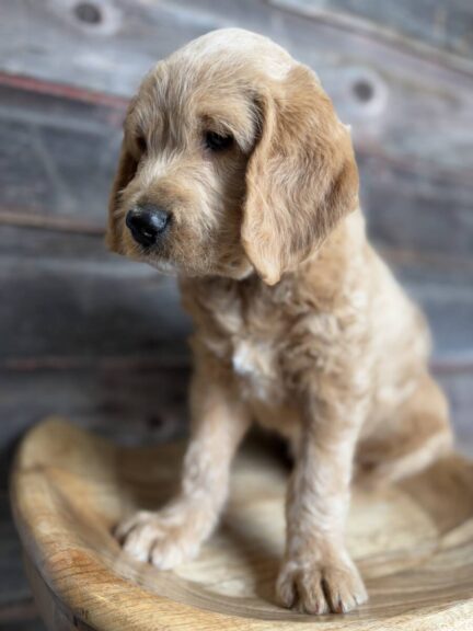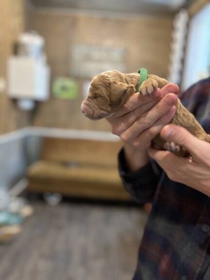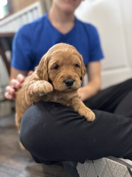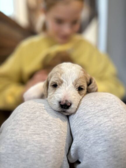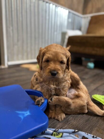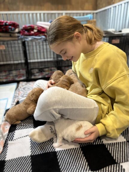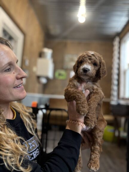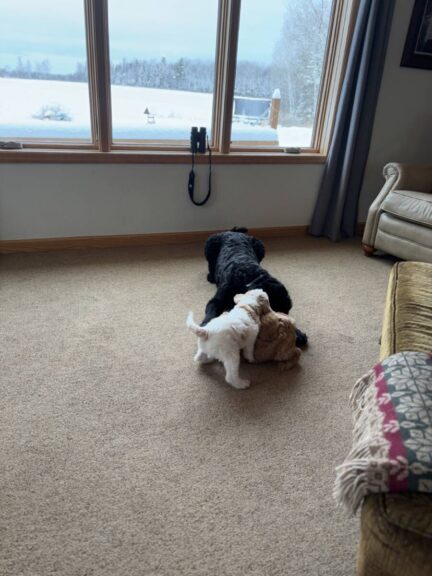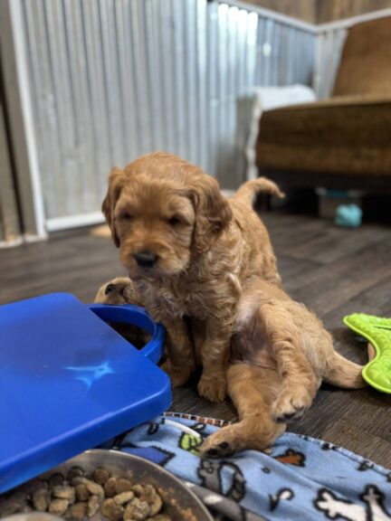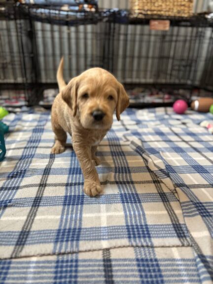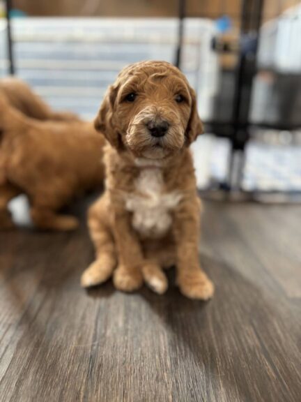 Puppies are at the funnest stage in our families opinion! They get so excited to see us and always are wagging their tails in excitement. We are looking forward this week as families start to pick their puppies. We will keep this page updated as puppies are chosen. This week we begin to have Kapri spend more time away from her puppies to start the weaning process. Puppies will have access to fresh water and by the end of the week will be eating 2-3 meals of very soft dog food. They will still nurse from Kapri but that will begin to be less as their teeth continue to grow in fully. We will continue to introduce them to new objects and toys daily. We will also work on startle response by making loud noises and then offer lots of reassurance. We also play a sounds CD several times daily to get them used to many sounds they may encounter during their lives like: fireworks, sirens, door bells, babies crying, and many more to help them become very accustomed to new sounds. We will have visits from more friends and family to give them lots of attention and get them used to more people. Puppies also will start to spend time outside as weather permits. This will get longer each day and potty breaks will be offered outside until they can start to use the doggie door and choose to go outside to potty on their own. Puppies will be separated from their siblings for short periods daily to interact with us 1 on 1. We will enlarge their area to give them more room to play and explore while continuing to provide an area for them to go potty. They will spend short periods of time in a crate just to become familiar with this new space. So many fun things to come this week!