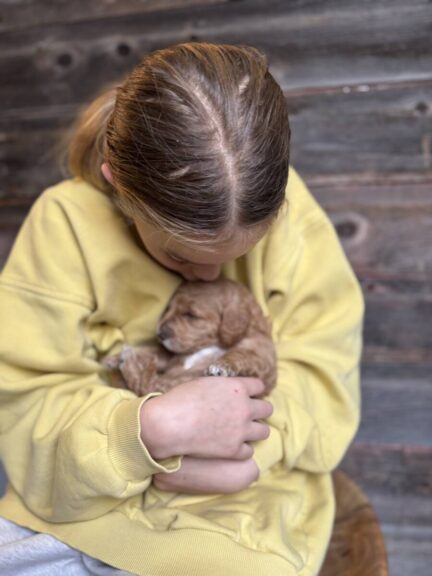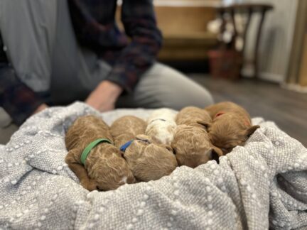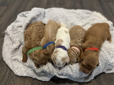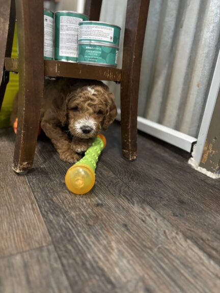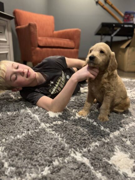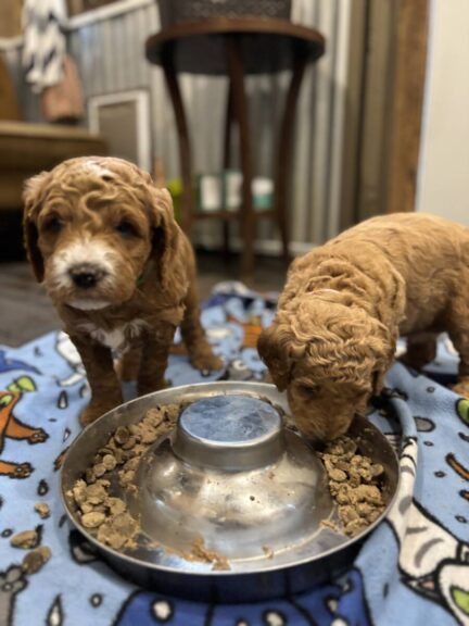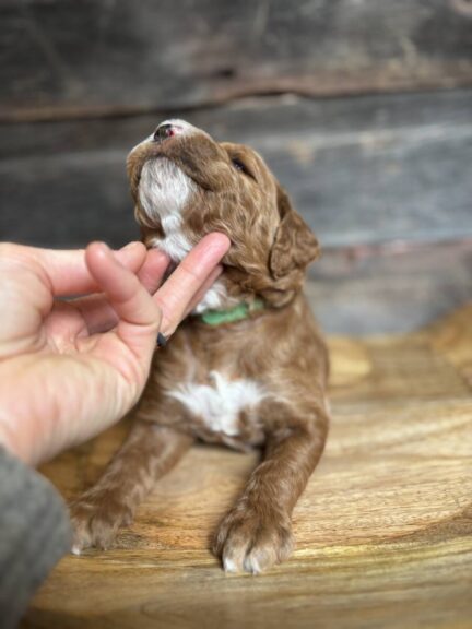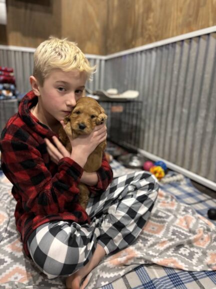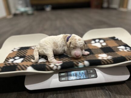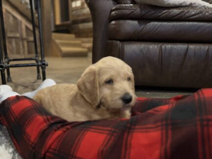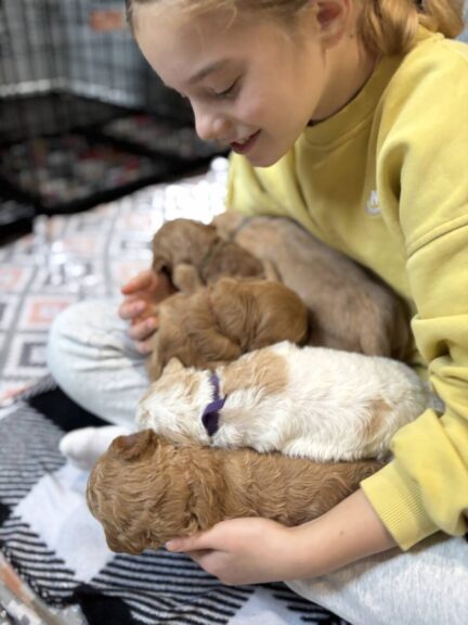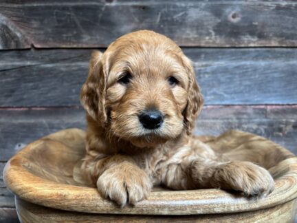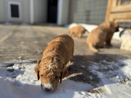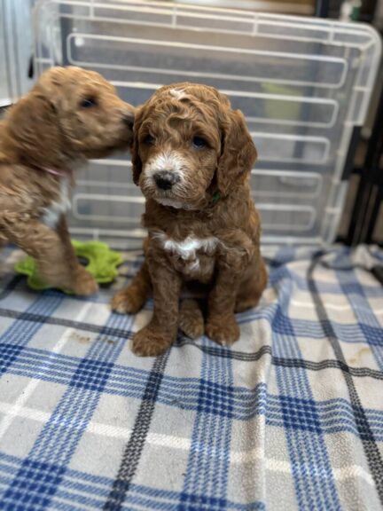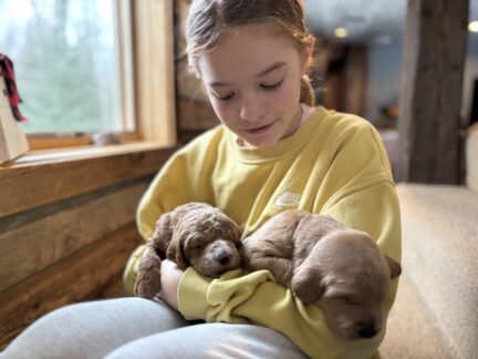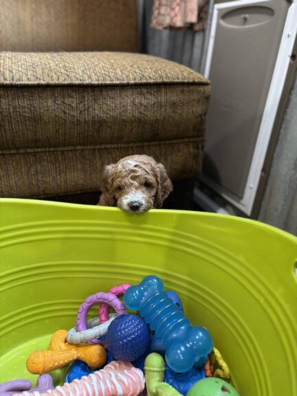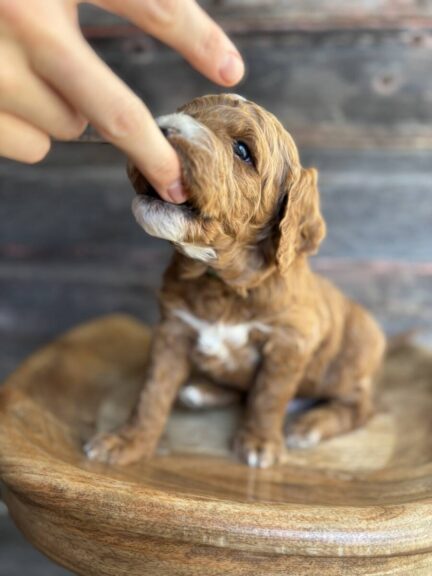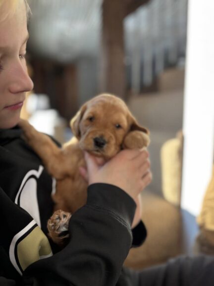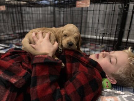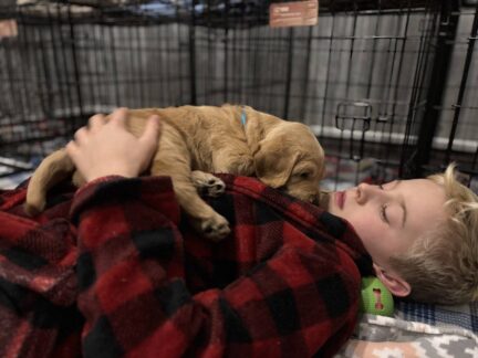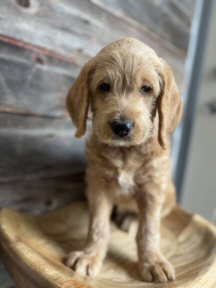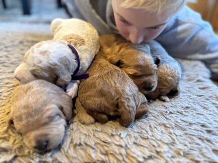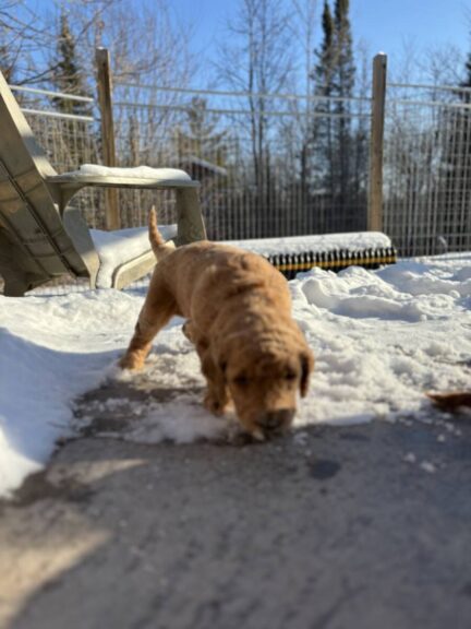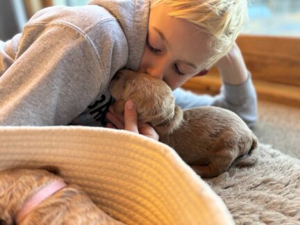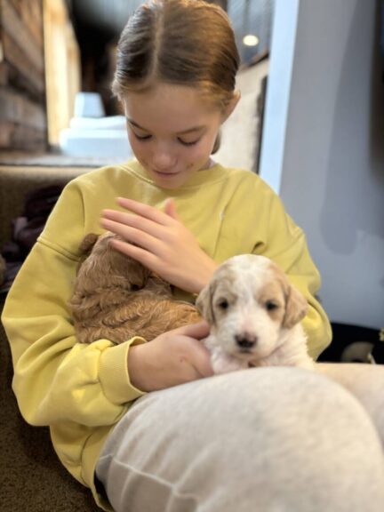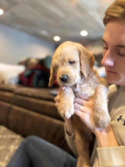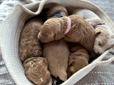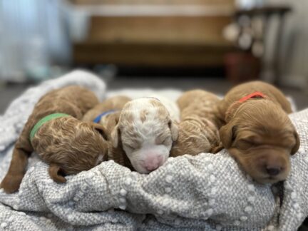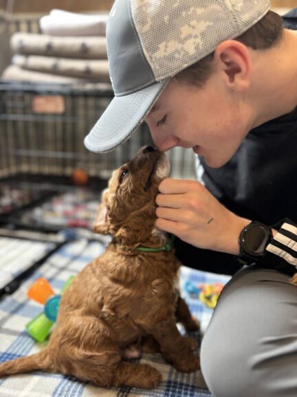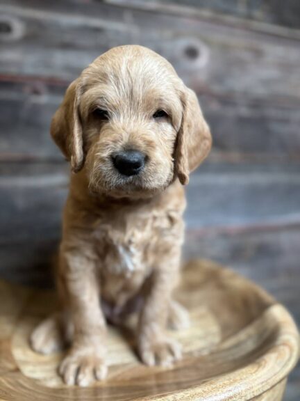 Puppies are at the funnest stage in our families opinion! They get so excited to see us and always are wagging their tails in excitement. We are looking forward this week as families start to pick their puppies. We will keep this page updated as puppies are chosen. This week we begin to have Kapri spend more time away from her puppies to start the weaning process. Puppies will have access to fresh water and by the end of the week will be eating 2-3 meals of very soft dog food. They will still nurse from Kapri but that will begin to be less as their teeth continue to grow in fully. We will continue to introduce them to new objects and toys daily. We will also work on startle response by making loud noises and then offer lots of reassurance. We also play a sounds CD several times daily to get them used to many sounds they may encounter during their lives like: fireworks, sirens, door bells, babies crying, and many more to help them become very accustomed to new sounds. We will have visits from more friends and family to give them lots of attention and get them used to more people. Puppies also will start to spend time outside as weather permits. This will get longer each day and potty breaks will be offered outside until they can start to use the doggie door and choose to go outside to potty on their own. Puppies will be separated from their siblings for short periods daily to interact with us 1 on 1. We will enlarge their area to give them more room to play and explore while continuing to provide an area for them to go potty. They will spend short periods of time in a crate just to become familiar with this new space. So many fun things to come this week!