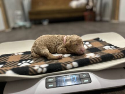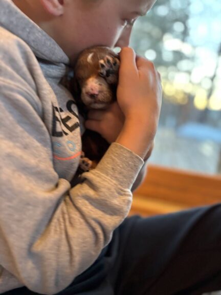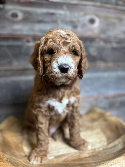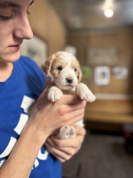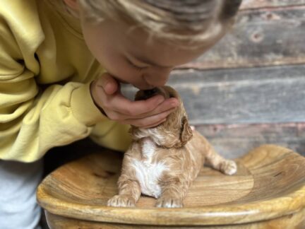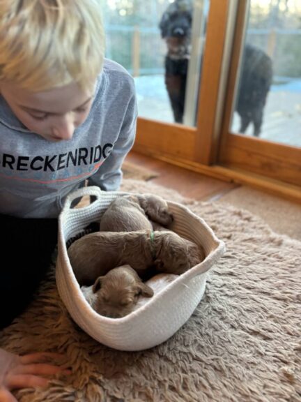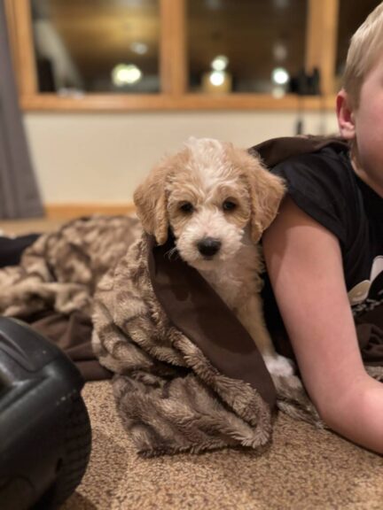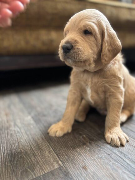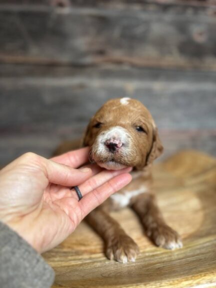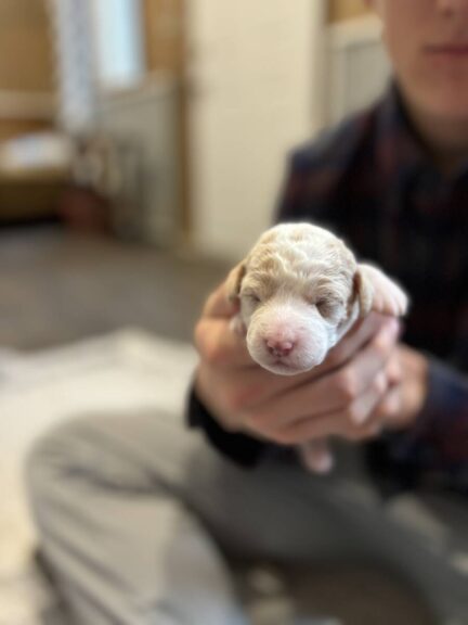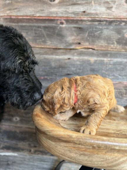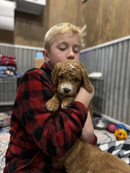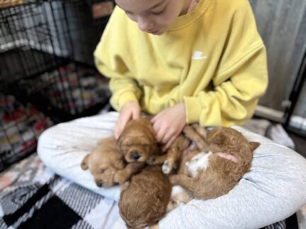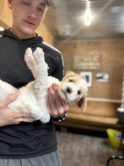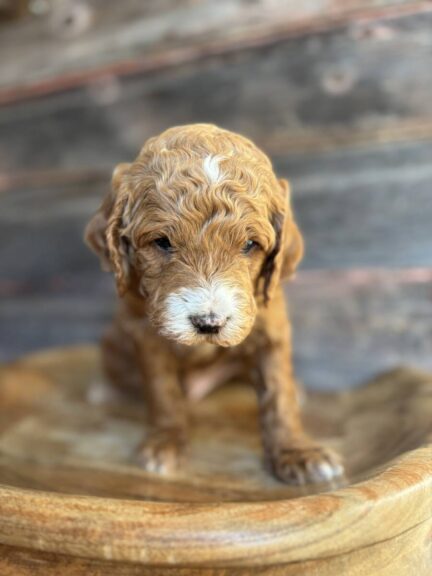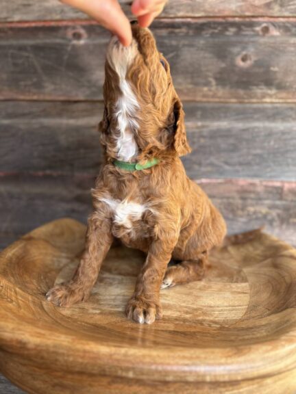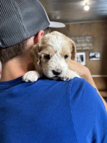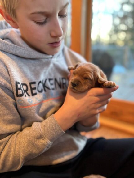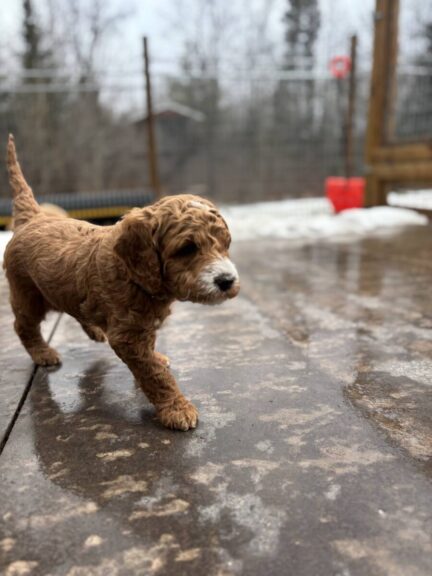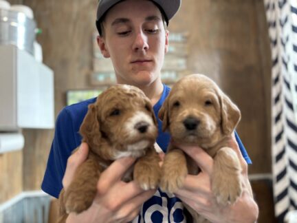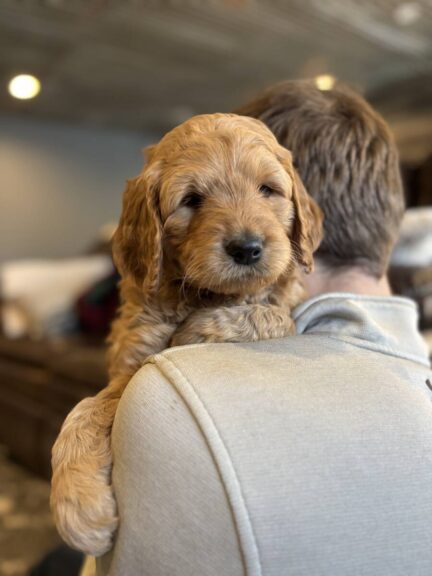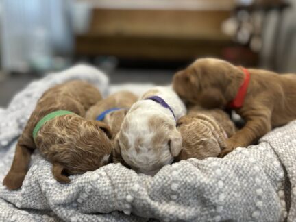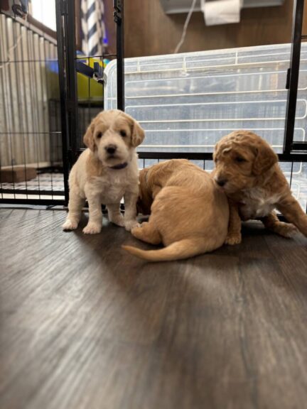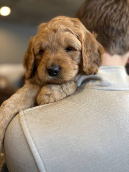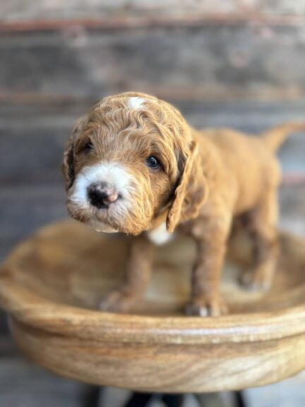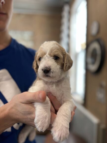 Puppies are at the funnest stage in our families opinion! They get so excited to see us and always are wagging their tails in excitement. We are looking forward this week as families start to pick their puppies. We will keep this page updated as puppies are chosen. This week we begin to have Kapri spend more time away from her puppies to start the weaning process. Puppies will have access to fresh water and by the end of the week will be eating 2-3 meals of very soft dog food. They will still nurse from Kapri but that will begin to be less as their teeth continue to grow in fully. We will continue to introduce them to new objects and toys daily. We will also work on startle response by making loud noises and then offer lots of reassurance. We also play a sounds CD several times daily to get them used to many sounds they may encounter during their lives like: fireworks, sirens, door bells, babies crying, and many more to help them become very accustomed to new sounds. We will have visits from more friends and family to give them lots of attention and get them used to more people. Puppies also will start to spend time outside as weather permits. This will get longer each day and potty breaks will be offered outside until they can start to use the doggie door and choose to go outside to potty on their own. Puppies will be separated from their siblings for short periods daily to interact with us 1 on 1. We will enlarge their area to give them more room to play and explore while continuing to provide an area for them to go potty. They will spend short periods of time in a crate just to become familiar with this new space. So many fun things to come this week!