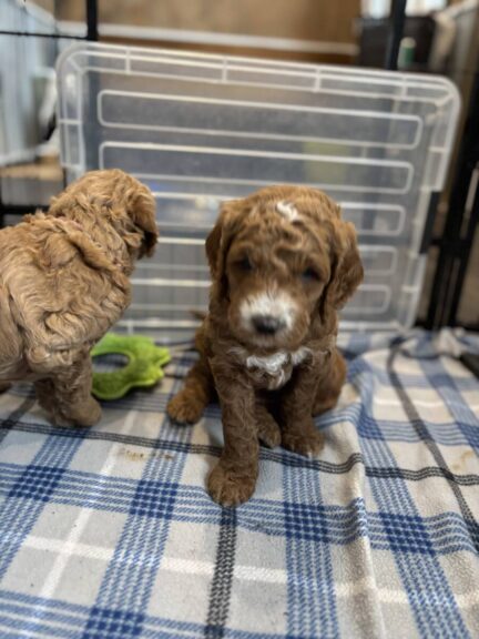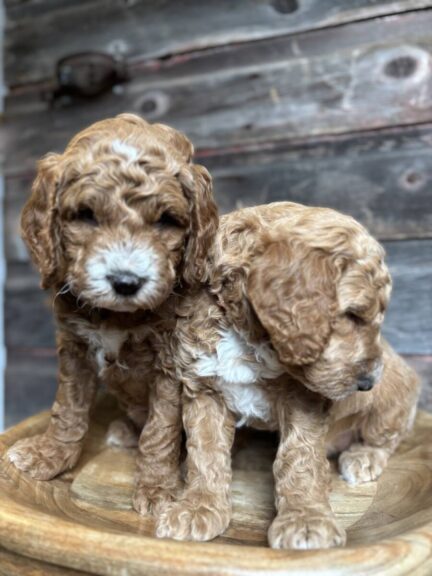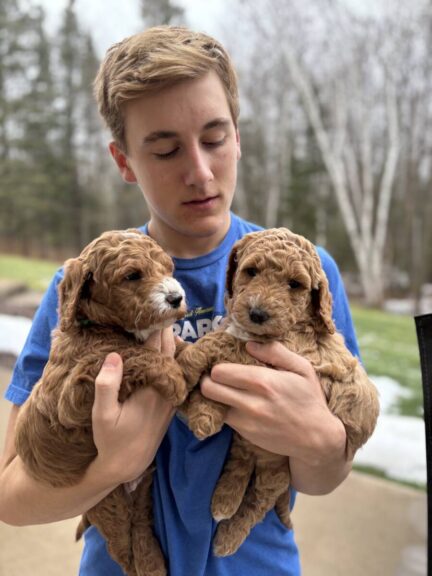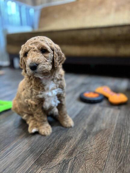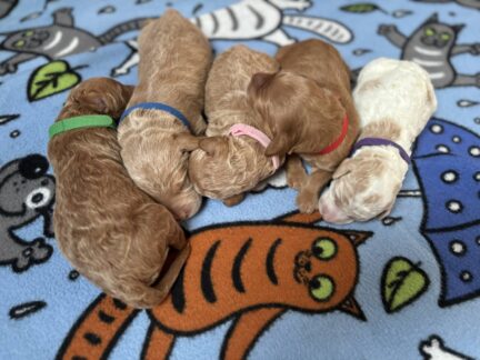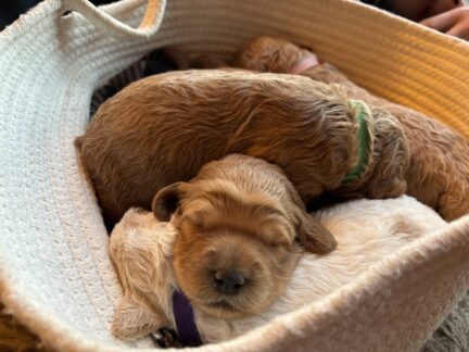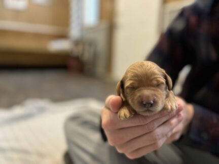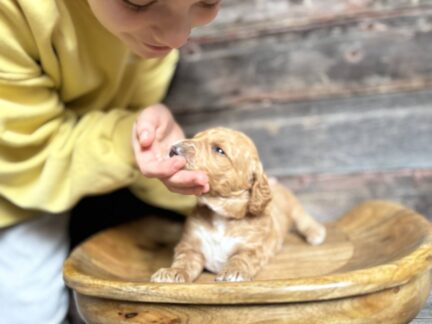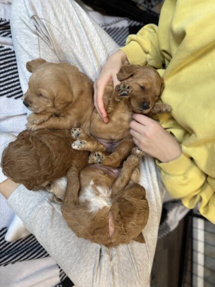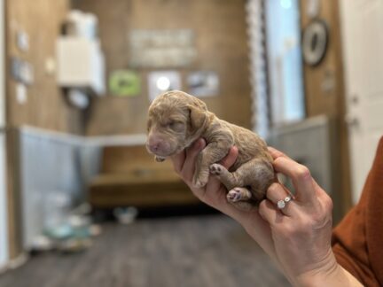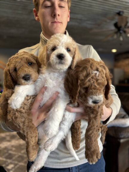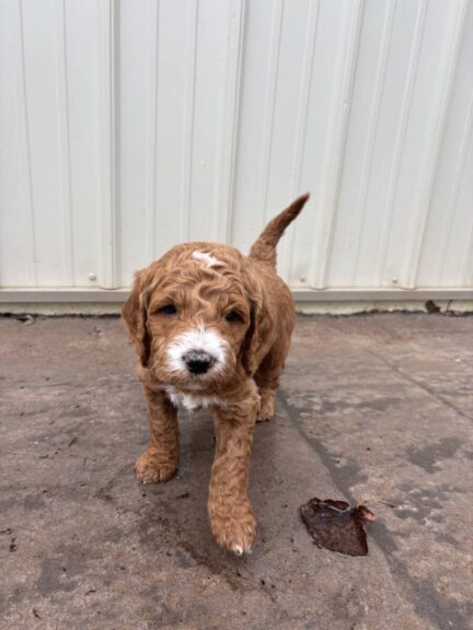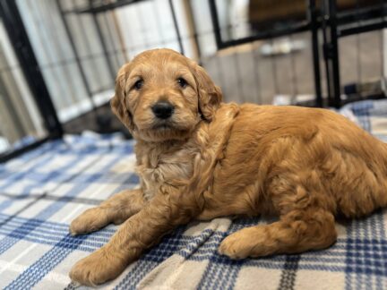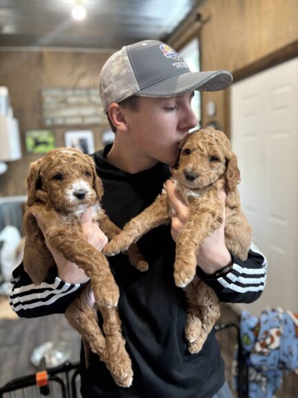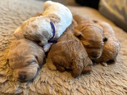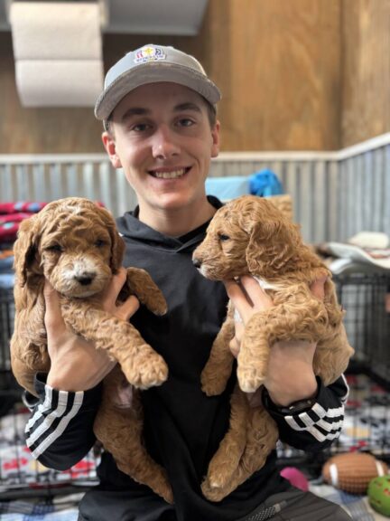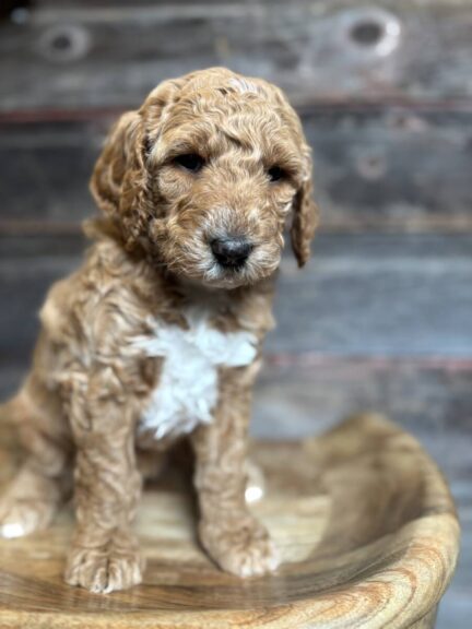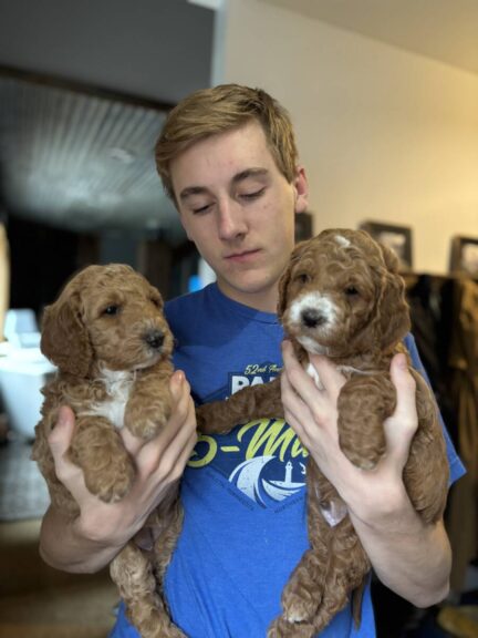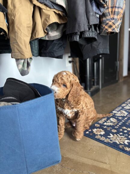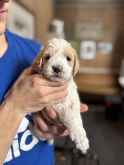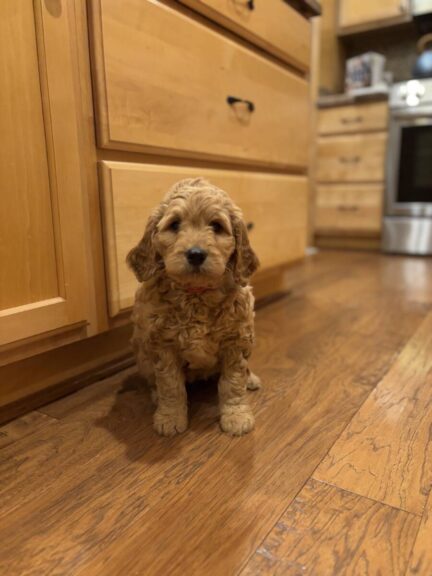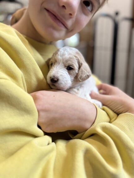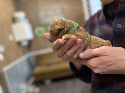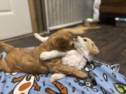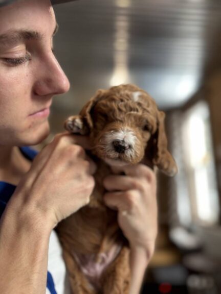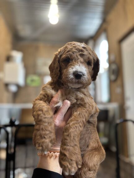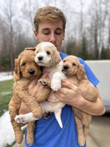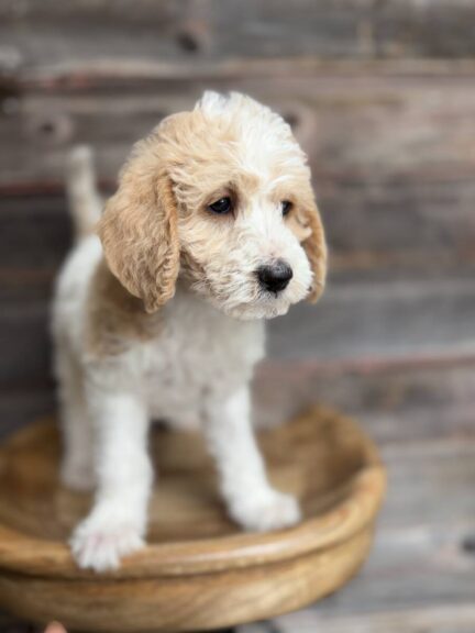 Puppies are at the funnest stage in our families opinion! They get so excited to see us and always are wagging their tails in excitement. We are looking forward this week as families start to pick their puppies. We will keep this page updated as puppies are chosen. This week we begin to have Kapri spend more time away from her puppies to start the weaning process. Puppies will have access to fresh water and by the end of the week will be eating 2-3 meals of very soft dog food. They will still nurse from Kapri but that will begin to be less as their teeth continue to grow in fully. We will continue to introduce them to new objects and toys daily. We will also work on startle response by making loud noises and then offer lots of reassurance. We also play a sounds CD several times daily to get them used to many sounds they may encounter during their lives like: fireworks, sirens, door bells, babies crying, and many more to help them become very accustomed to new sounds. We will have visits from more friends and family to give them lots of attention and get them used to more people. Puppies also will start to spend time outside as weather permits. This will get longer each day and potty breaks will be offered outside until they can start to use the doggie door and choose to go outside to potty on their own. Puppies will be separated from their siblings for short periods daily to interact with us 1 on 1. We will enlarge their area to give them more room to play and explore while continuing to provide an area for them to go potty. They will spend short periods of time in a crate just to become familiar with this new space. So many fun things to come this week!