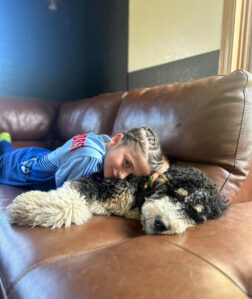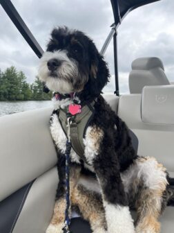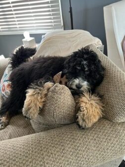 Gia is an F1 Bernedoodle from our Stella and Beau litter. She lives with her guardian family very near to our home. She is so very sweet, smart, snuggly, and obedient. We have her while her family travels at times and love how adaptable she is! Here is what her family has to say about her: