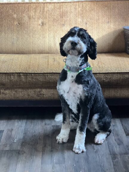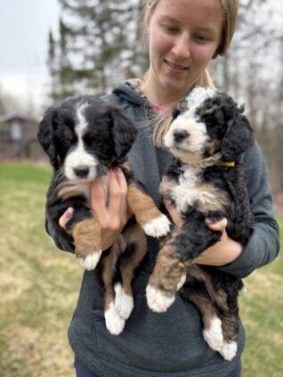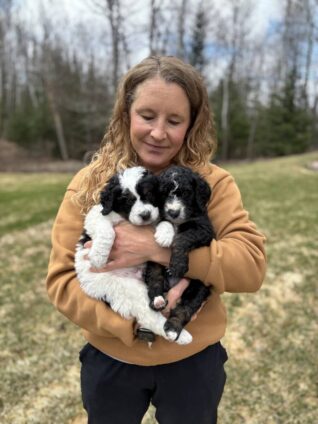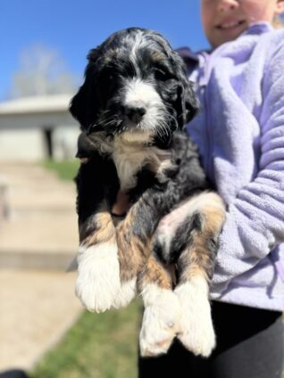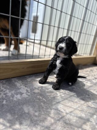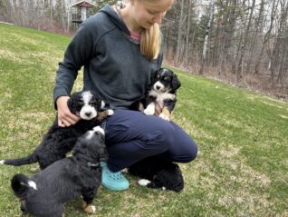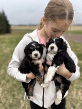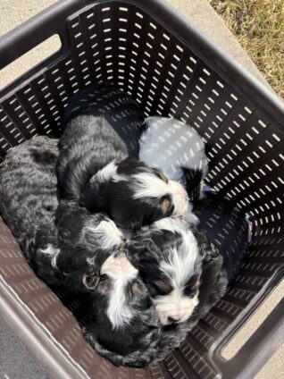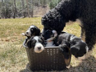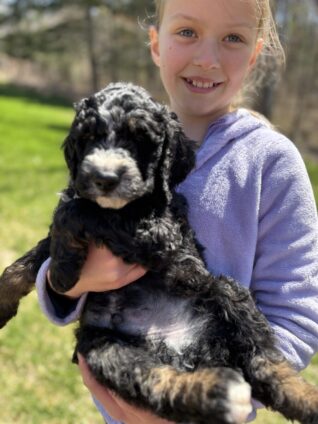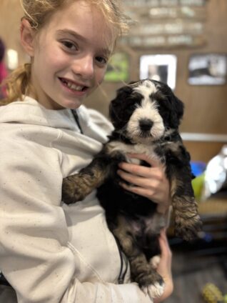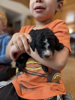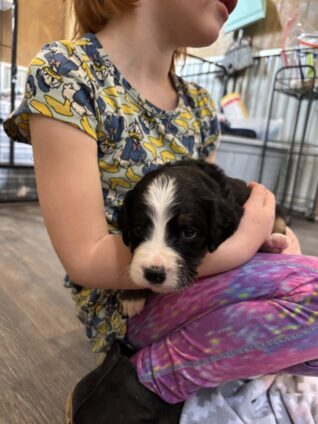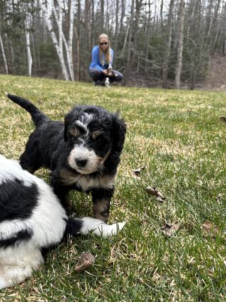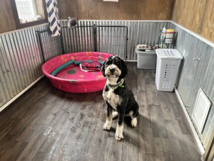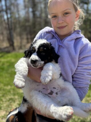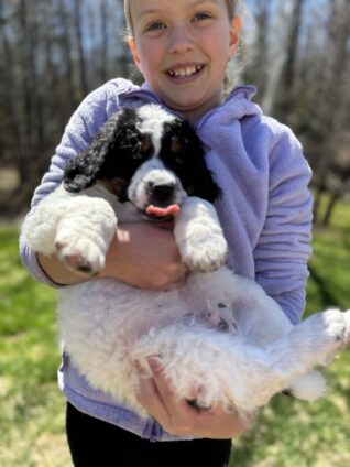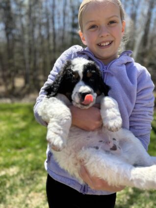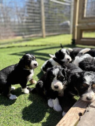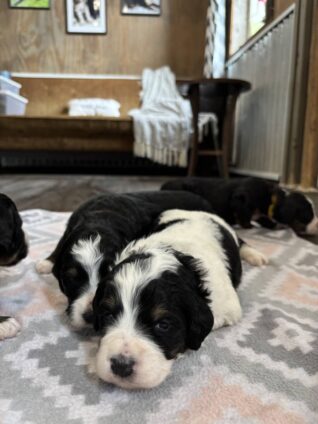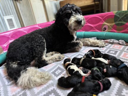 Puppies are 5 weeks old this week and developing before our eyes! They have mastered the doggie door and most potties are being done outdoors now except on the rainy days…the really dislike the rain. They are eating 3 soft meals daily and will begin on hard dog food the end of this week. Ueacker is taking longer breaks from them and nursing less as their teeth are very sharp which helps in the weaning process. It was so fun to meet more of our families this past week as they picked which puppy would join their family! We love all the names that have been given so far and are enjoying calling them each by it. Puppies have chosen to all snuggle in a large crate for a few naps which is a great start to acclimating them each in their own. We will gradually start to put them in a crate for short periods with a buddy this week to continue to acclimate them to the crate until they go home. Our big girls continue visit puppies to give them new interactions and they will continue to spend time in new areas to provide new experiences to them. We have more planned visits with fiends also to give them positive interactions with more humans.