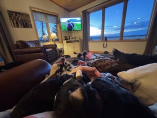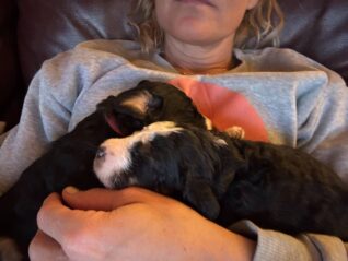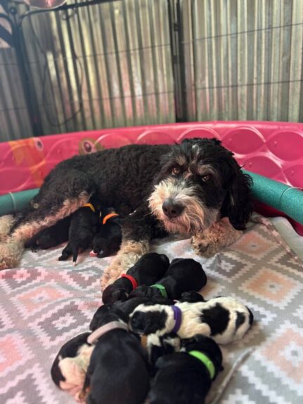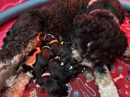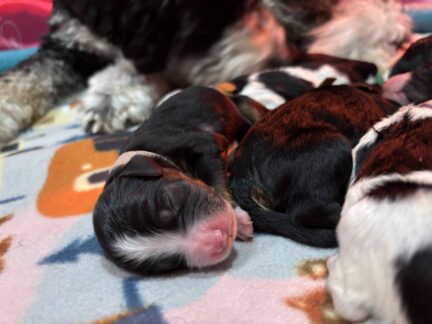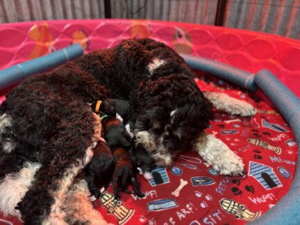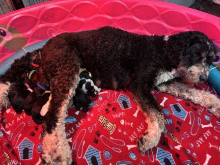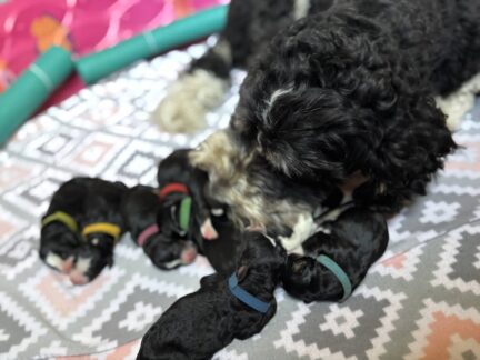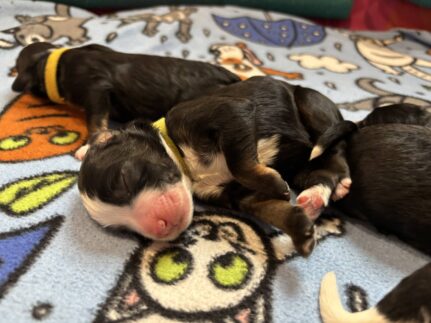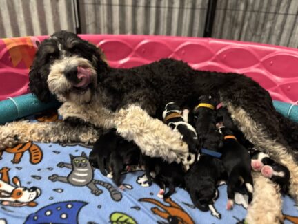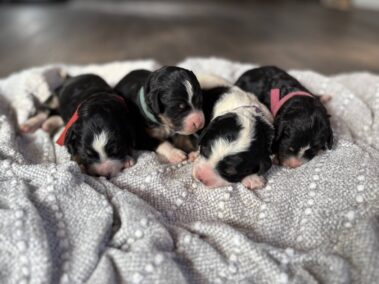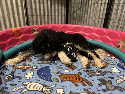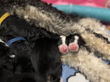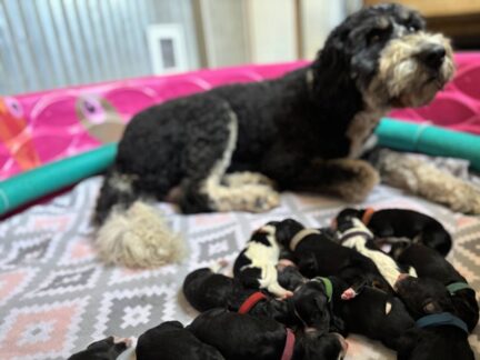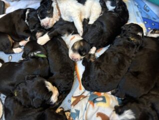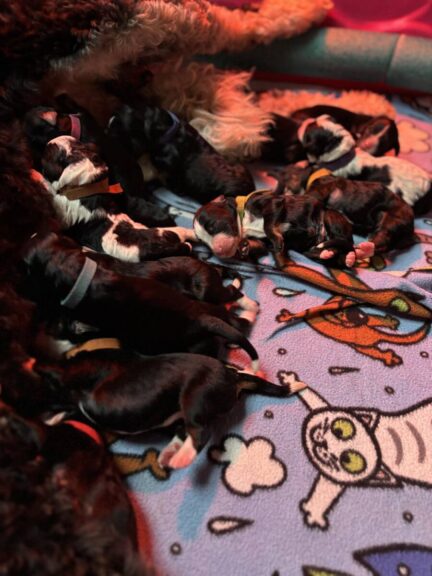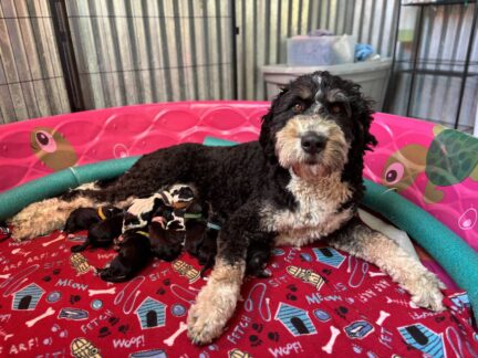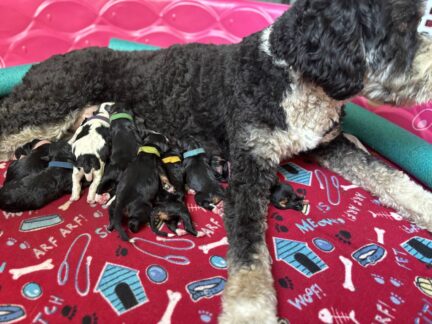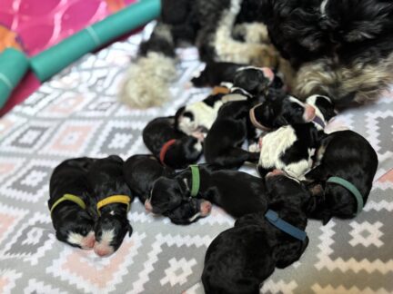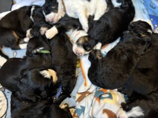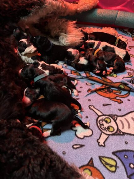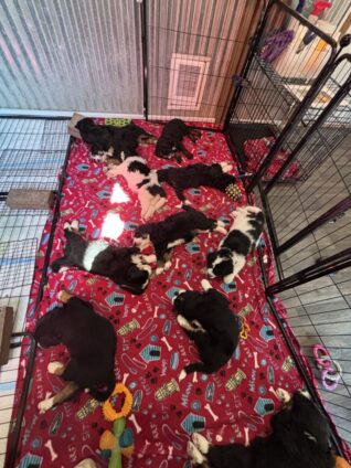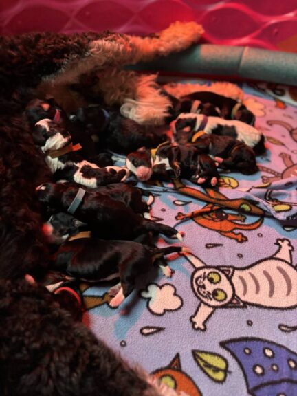 Puppies started to make their arrival very early this morning as predicted! So far we have 11 total (7 girls & 4 boys). All are doing very well and eating lots already! They range in size from 10 – 15 oz. They are so colorful and truly all so beautiful. This process never gets old and the amazing, intricate little bodies of each puppy is such a miracle. Our big girls sure can tell there is excitement in the air so I had to show some pictures of them eagerly waiting.