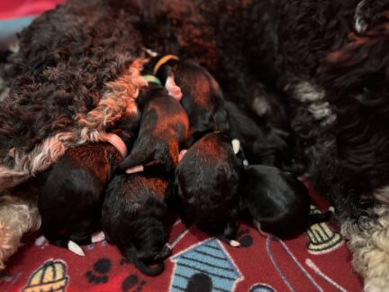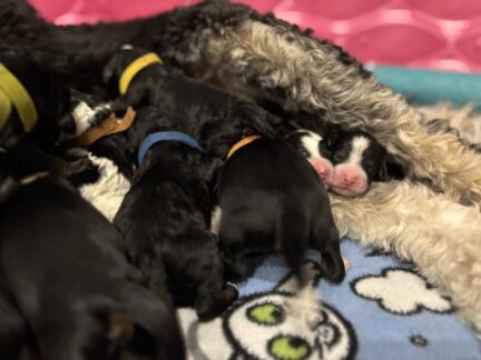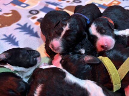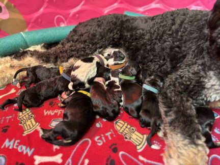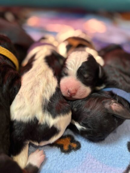 Puppies are doing very well and growing quickly as expected! We are just overwhelmed with how beautiful they are and again with the miracle of the process. Uecker is such an amazing mother and so very gentle and attentive with her puppies. Today we are still keeping the area, very quiet and calm to give them time to continue to bond and nurse well. Hopefully by the middle of the week, we will take individual pictures to better introduce you to each puppy.