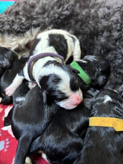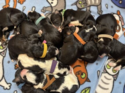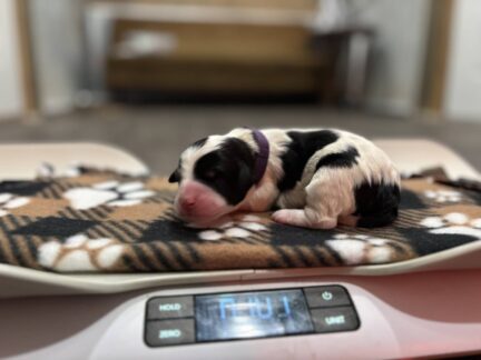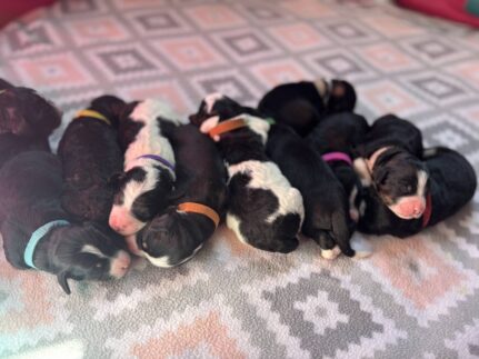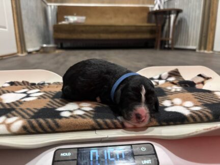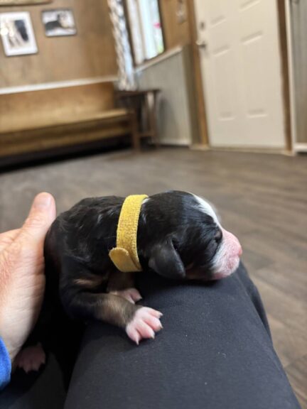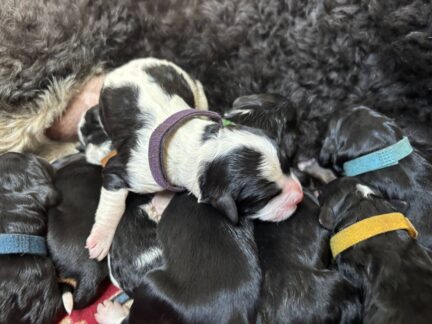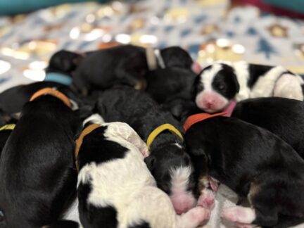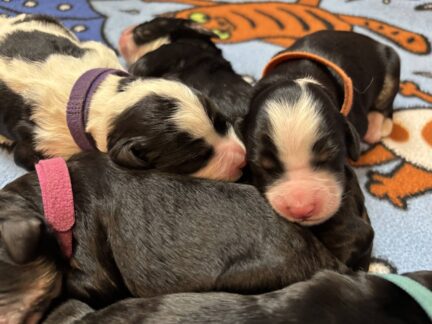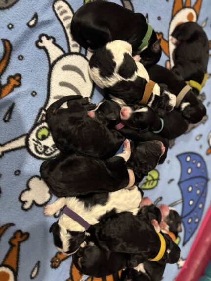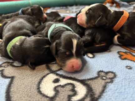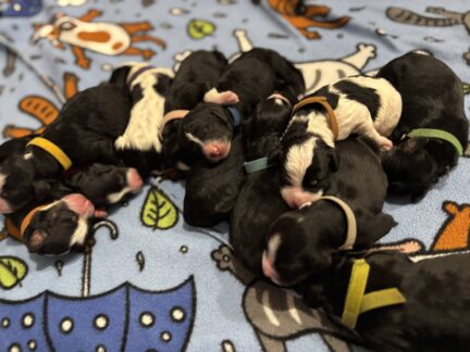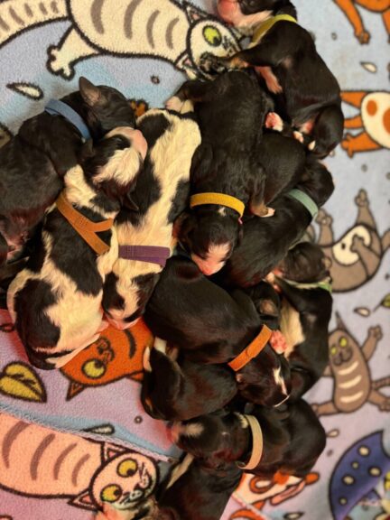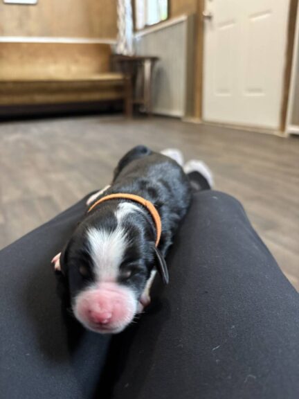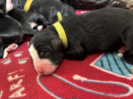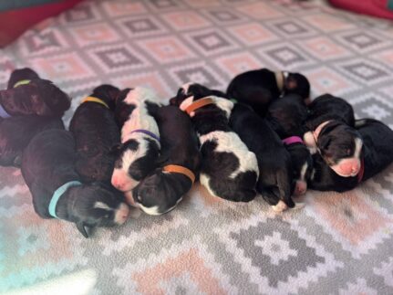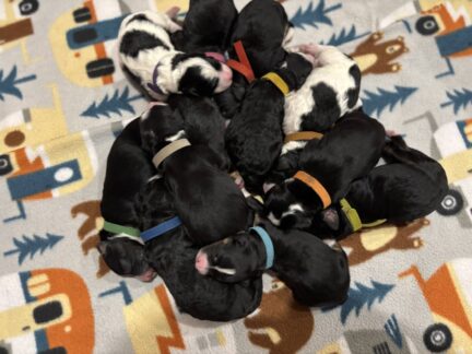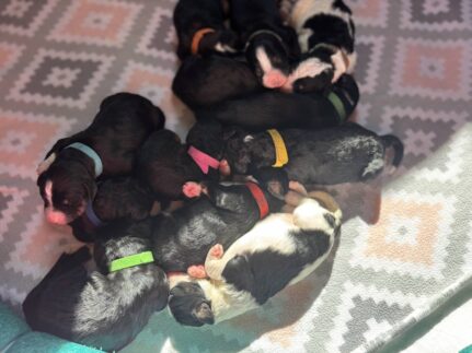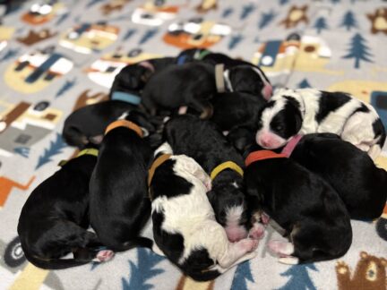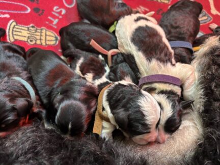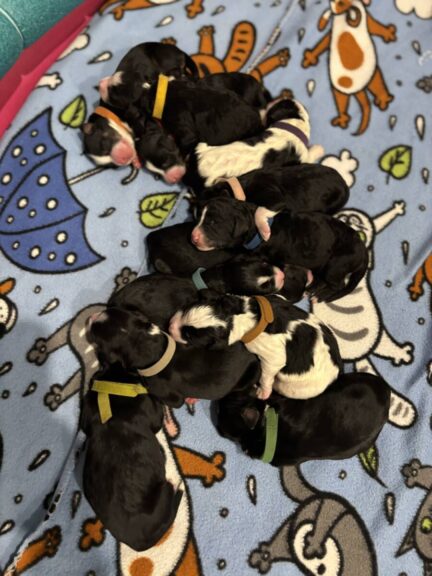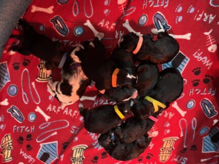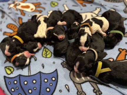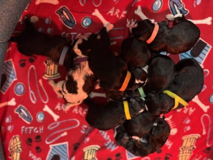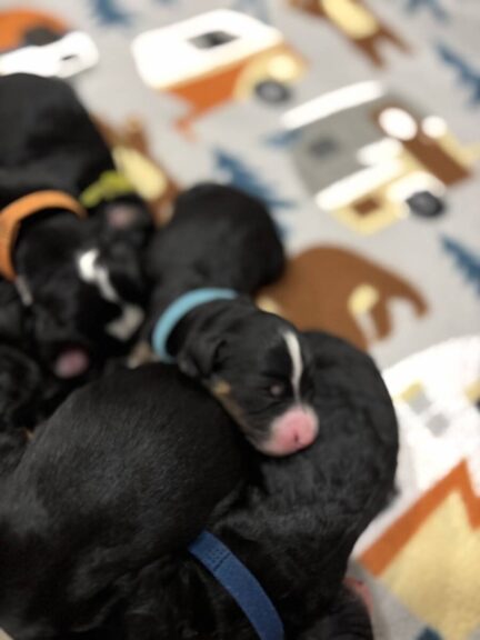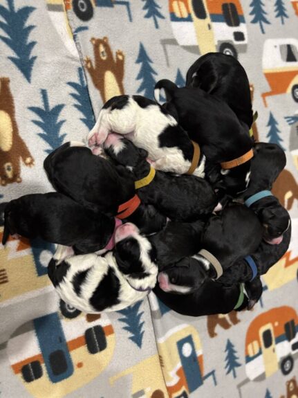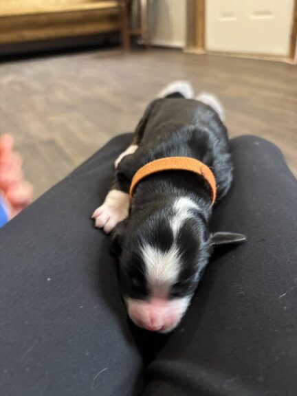 Puppies all did very well with their rear dew claw removal yesterday. and initial vet check! Today is the start of our favorite part of puppies, the fun of Early Neurologic Stimulation otherwise called “ENS” time. This process is started to help introduce mild stresses to each puppy in a controlled way. The stress helps to stimulate the neurological system which improves the growth and development of pups, immune system, cardiovascular system, and stress tolerance. We love this time daily as it more reason to snuggle each puppy and get to know them better. Each puppy has a colored collar to help you keep an eye on each puppy a bit better as you may have noticed with yesterday’s puppy introduction. This helps us keep an eye on each one’s growth and better helps families start to fall in love with specific puppies.