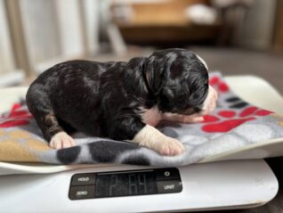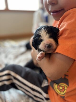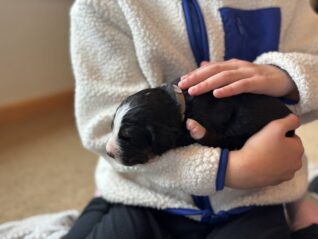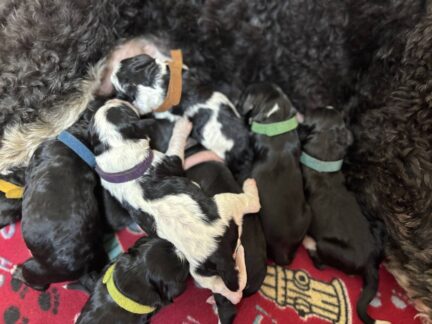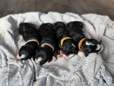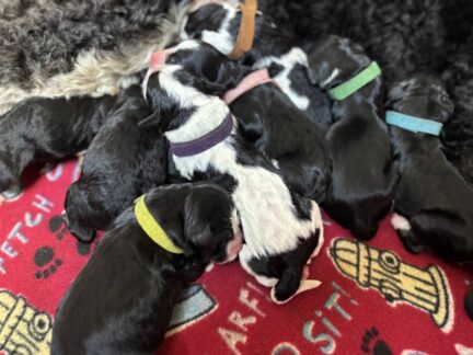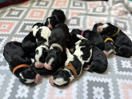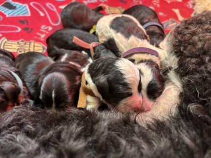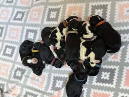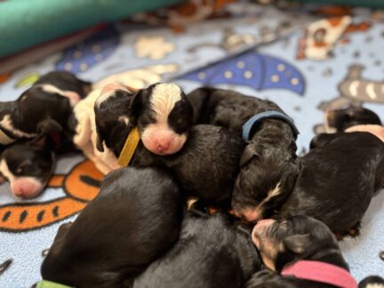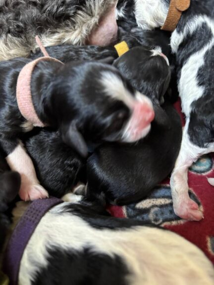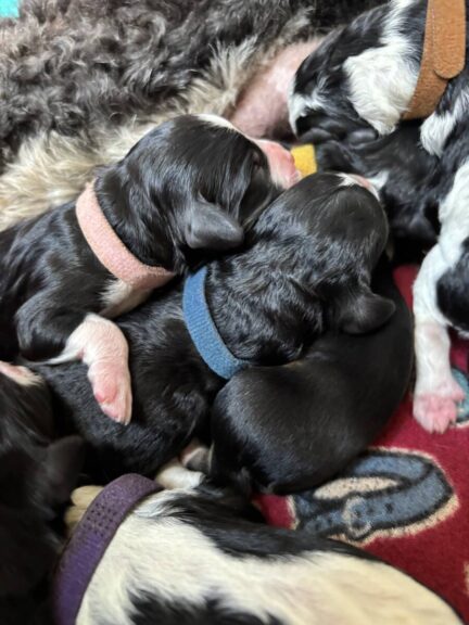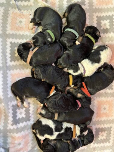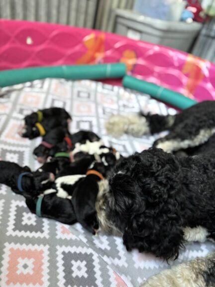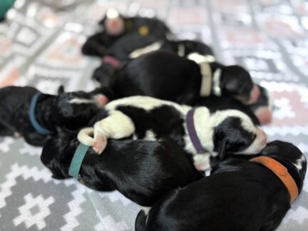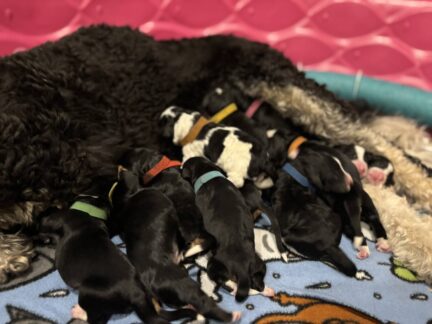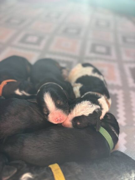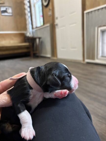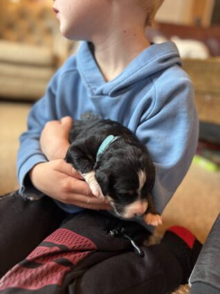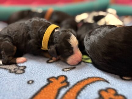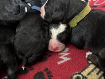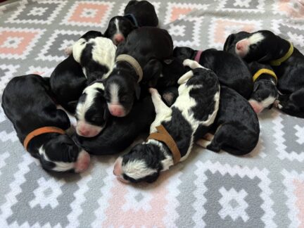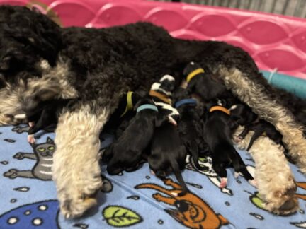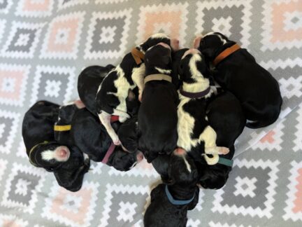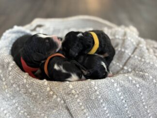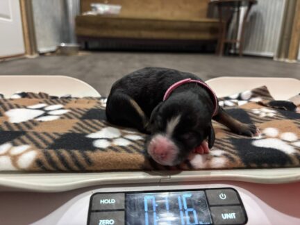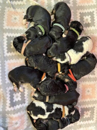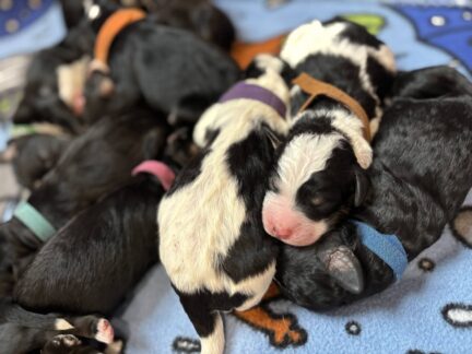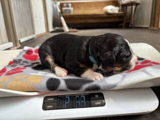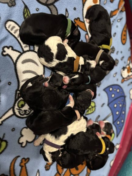 Puppies all did very well with their rear dew claw removal yesterday. and initial vet check! Today is the start of our favorite part of puppies, the fun of Early Neurologic Stimulation otherwise called “ENS” time. This process is started to help introduce mild stresses to each puppy in a controlled way. The stress helps to stimulate the neurological system which improves the growth and development of pups, immune system, cardiovascular system, and stress tolerance. We love this time daily as it more reason to snuggle each puppy and get to know them better. Each puppy has a colored collar to help you keep an eye on each puppy a bit better as you may have noticed with yesterday’s puppy introduction. This helps us keep an eye on each one’s growth and better helps families start to fall in love with specific puppies.