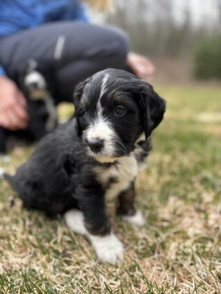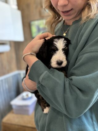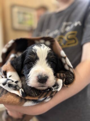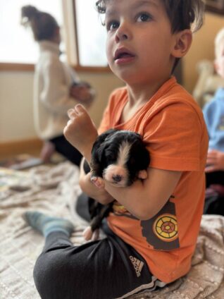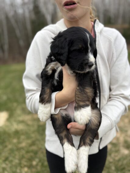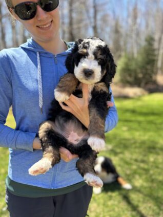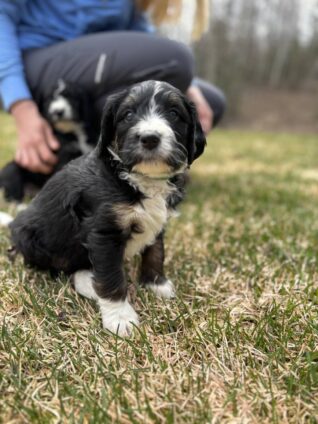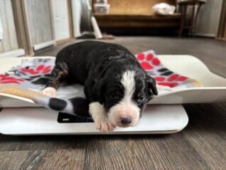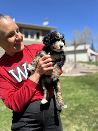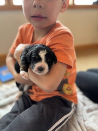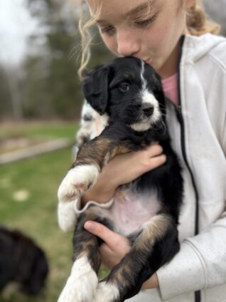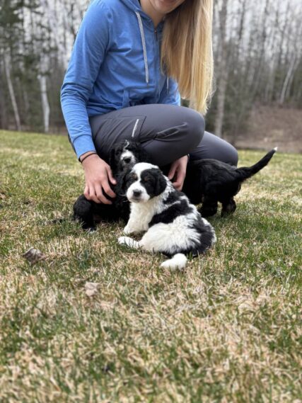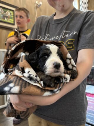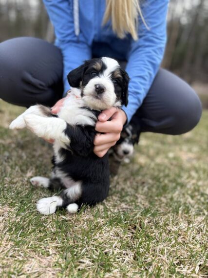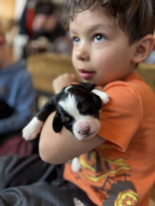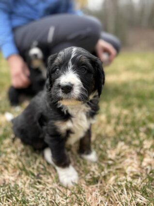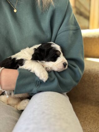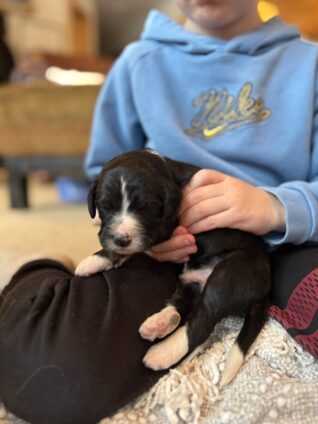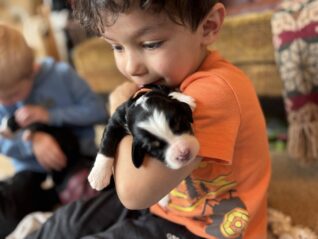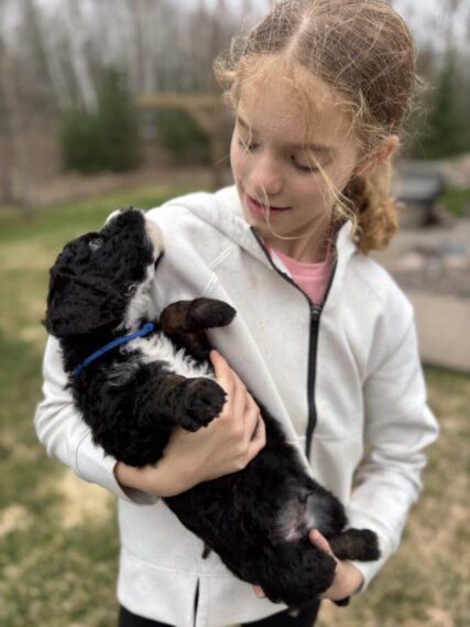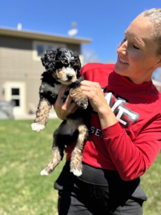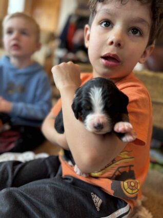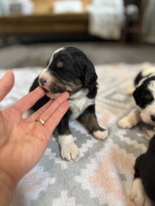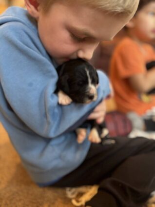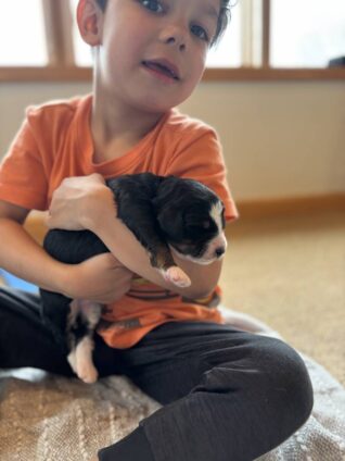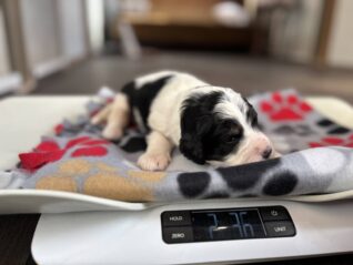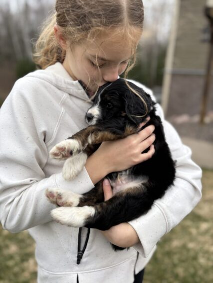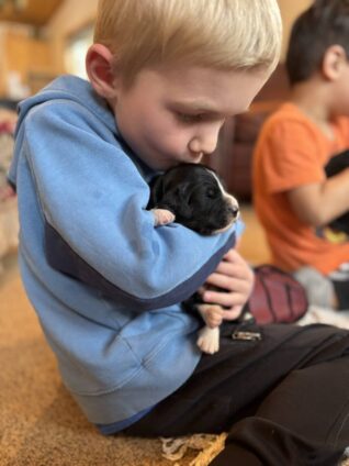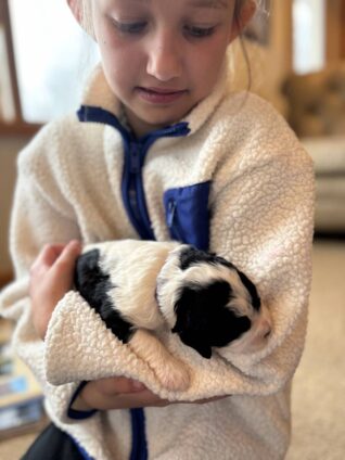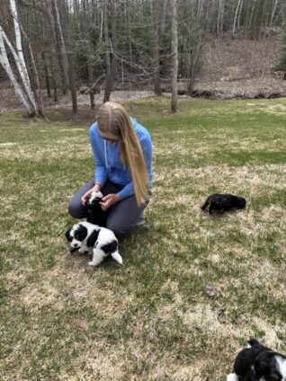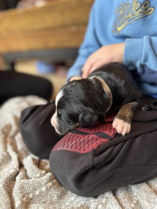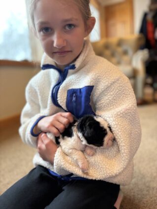 This week we will continue to have puppies spend naps in crates. Uecker has finished nursing and has gone home to her family to give puppies ample time to adjust to only eating dog food that we still soften. Puppies have their vet appointment Tuesday where they will have a full exam, vaccines, and be microchipped. Most potties are being done outside (unless we are distracted with visitors) and we are so excited for the sunshine and warmer temps that are coming to give puppies more time to play outside. They are very tolerant though and still brave the cold when they have had to. We have been giving puppies time individually inside to be on many different surfaces and have time to explore new areas without their siblings. We continue to give them time with our other dogs to help them become comfortable with other animals. We will begin to encourage puppies to sit when they greet us which is something that is so important to continue to reinforce once they come home. We are absolutely loving each puppy so much and can’t believe we so close to take home!