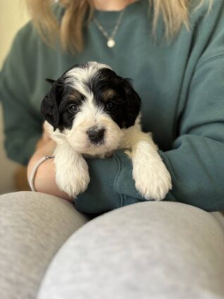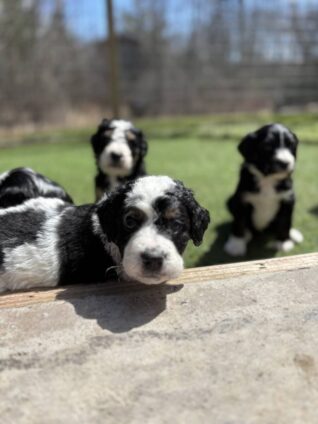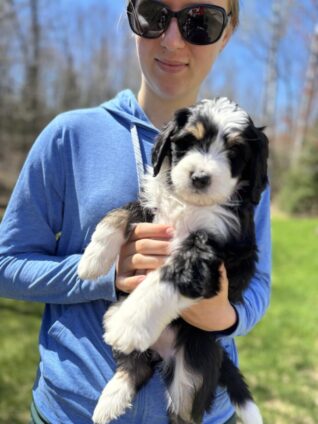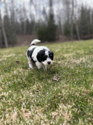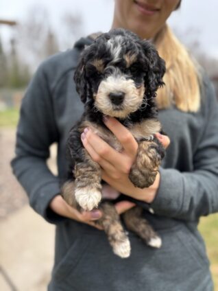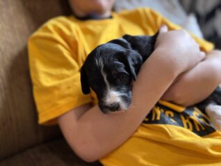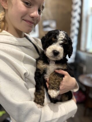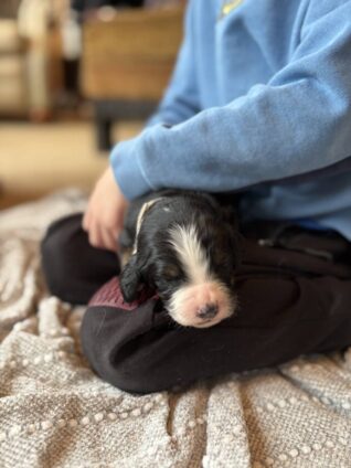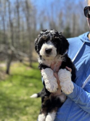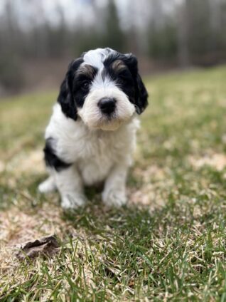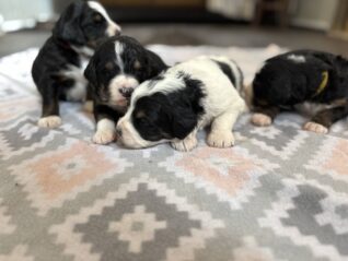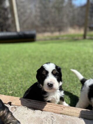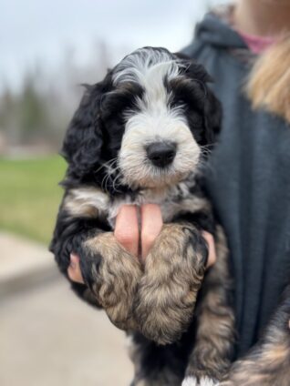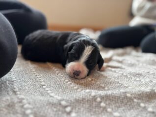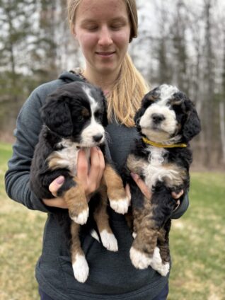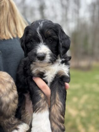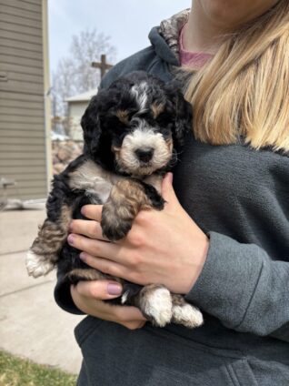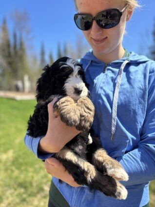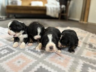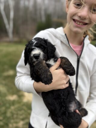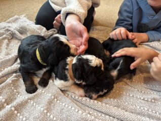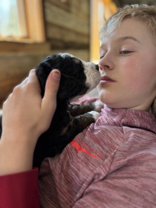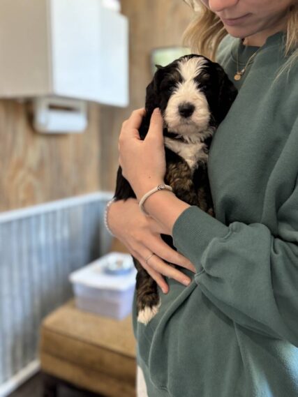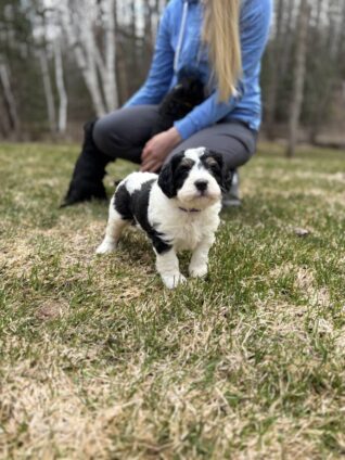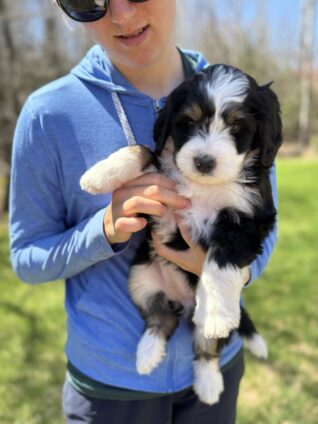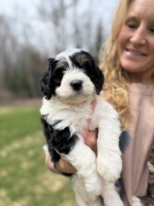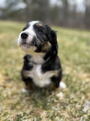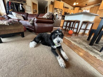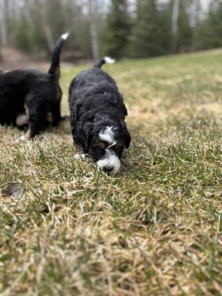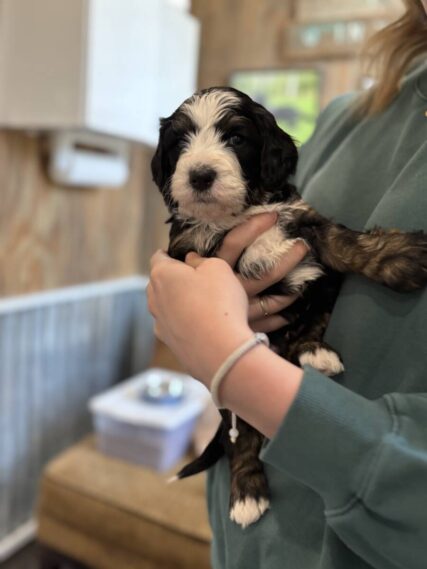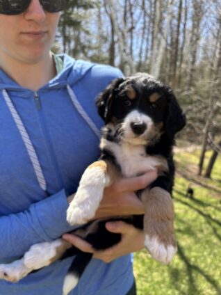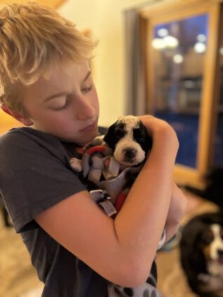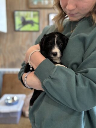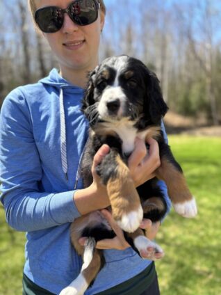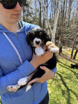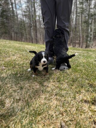 This week we will continue to have puppies spend naps in crates. Uecker has finished nursing and has gone home to her family to give puppies ample time to adjust to only eating dog food that we still soften. Puppies have their vet appointment Tuesday where they will have a full exam, vaccines, and be microchipped. Most potties are being done outside (unless we are distracted with visitors) and we are so excited for the sunshine and warmer temps that are coming to give puppies more time to play outside. They are very tolerant though and still brave the cold when they have had to. We have been giving puppies time individually inside to be on many different surfaces and have time to explore new areas without their siblings. We continue to give them time with our other dogs to help them become comfortable with other animals. We will begin to encourage puppies to sit when they greet us which is something that is so important to continue to reinforce once they come home. We are absolutely loving each puppy so much and can’t believe we so close to take home!